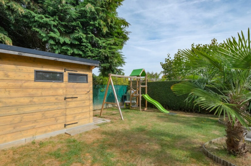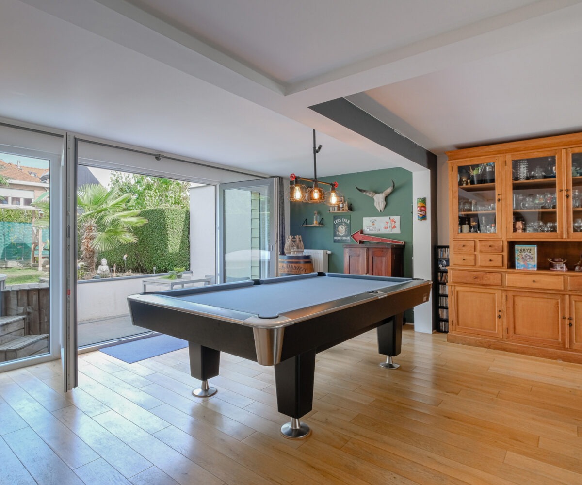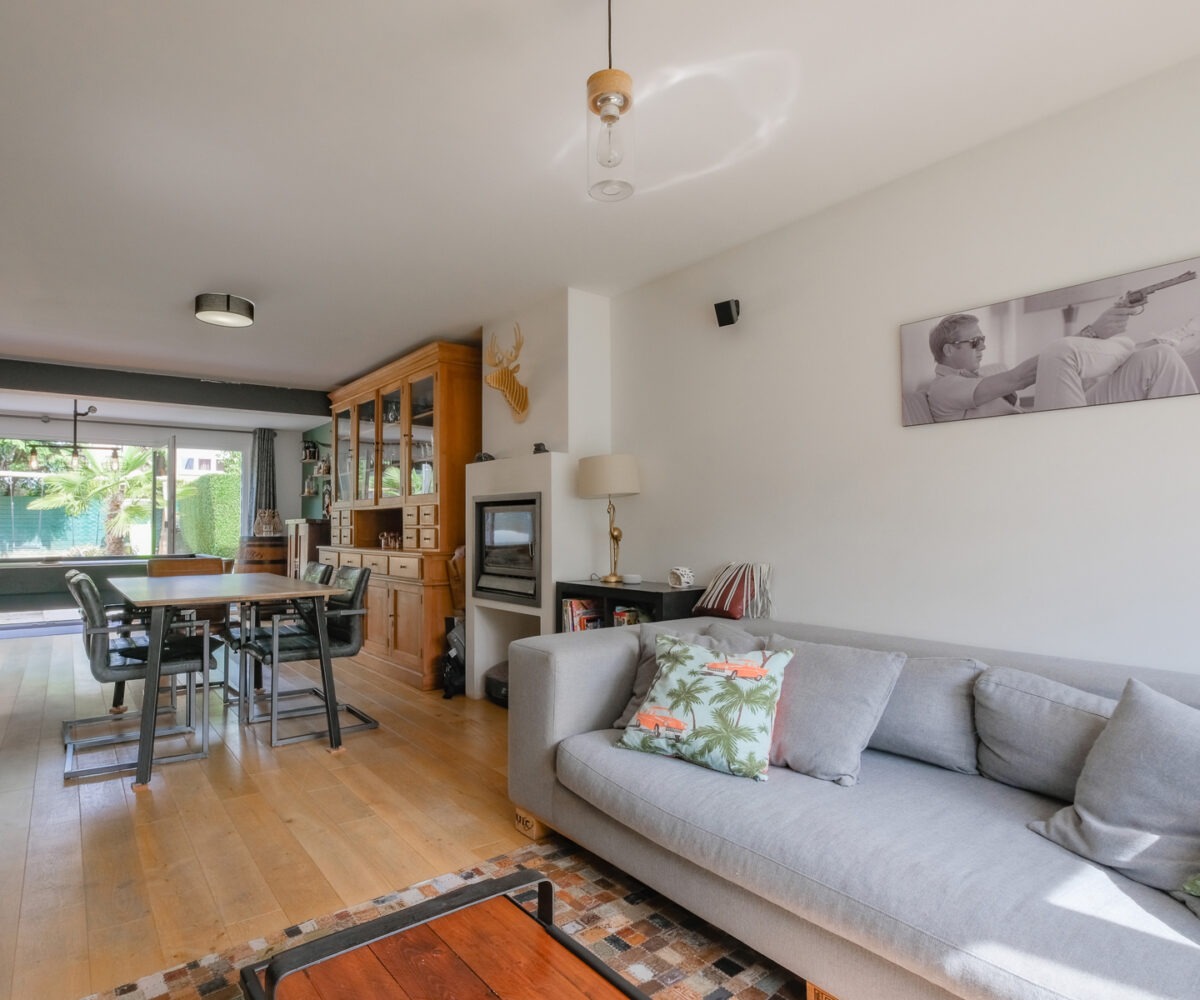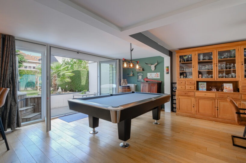 – Au rez-de-chaussée : Un hall d’entrée avec vestiaire et wc invité, un agréable séjour comprenant un espace salon, salle à manger et cuisine super-équipée ayant un accès à la terrasse et au jardin. Une buanderie et un garage.