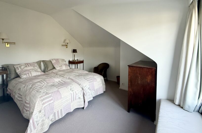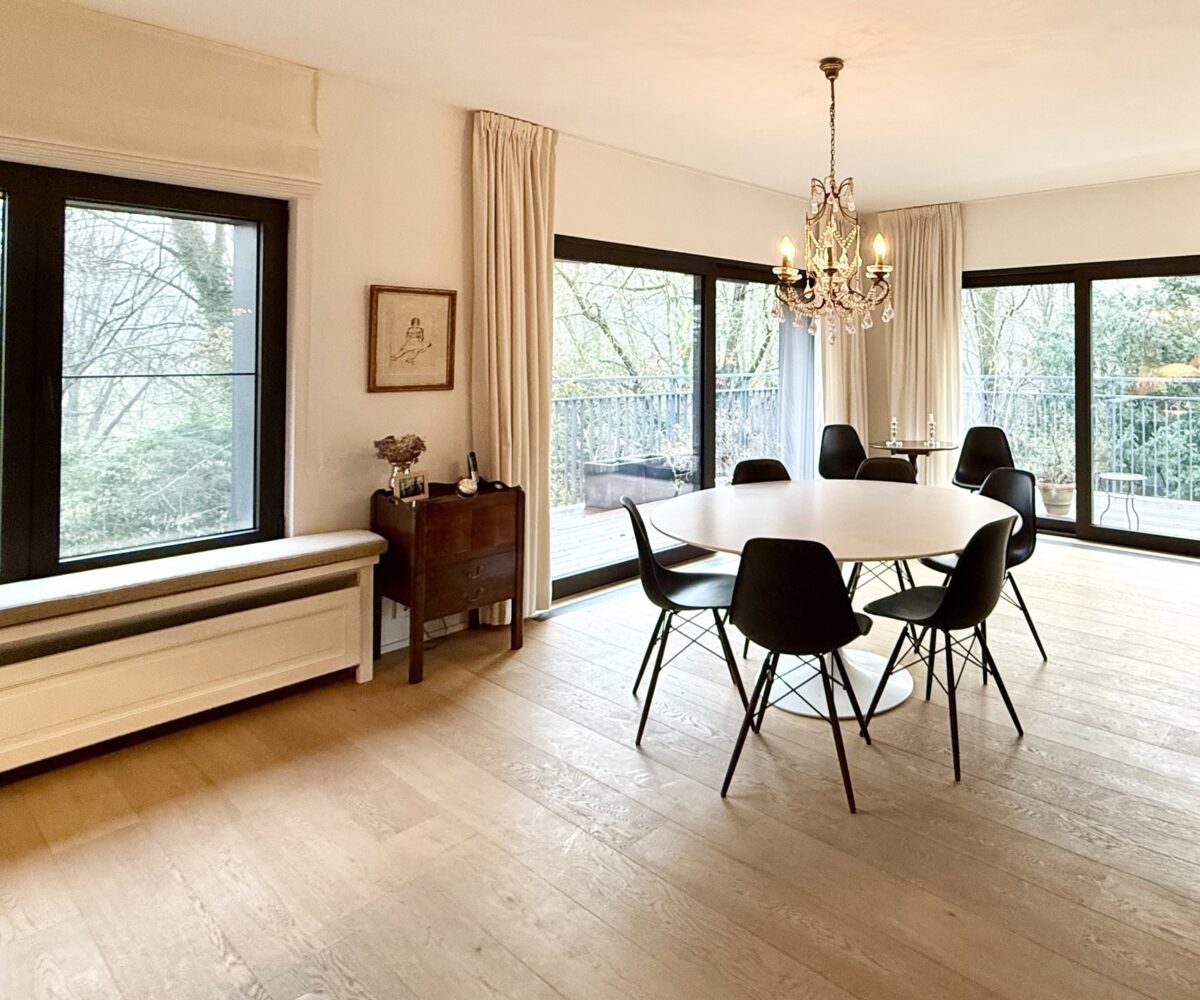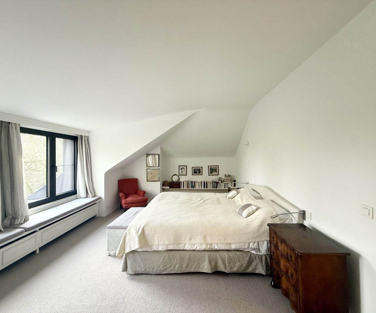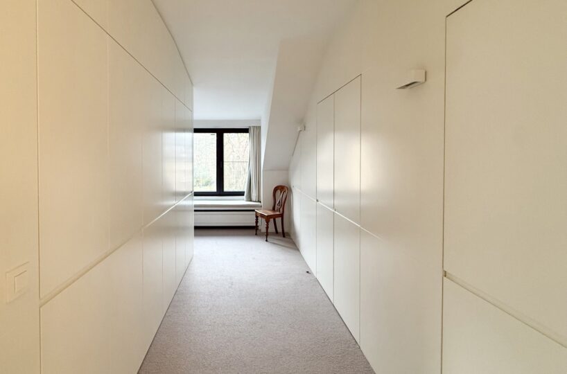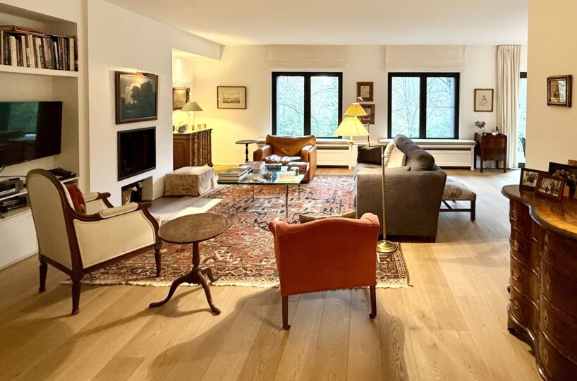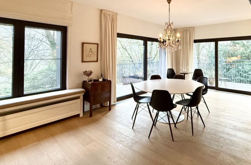Situé au 2ème et dernier étage d’une petite copropriété de 4 unités construite en 1977, l’appartement de 220m2 (selon PEB) entièrement rénové avec goût en 2015 est composé comme suit : A l’étage de vie : Un hall d’entrée avec meuble bibliothèque. Un vestiaire avec rangements sur-mesure et WC invité. Un agréable séjour comprenant un espace salon avec feu-ouvert et une salle à manger. Une magnifique cuisine entièrement équipée avec îlot central et hotte suspendue. Un bureau / chambre d’invité (20m2) avec salle de douche indépendante (douche, lavabo, WC). Une buanderie aménagée. Une magnifique terrasse de +- 37m2 orientée sud prolonge les espaces de vie et offre une grande luminosité.