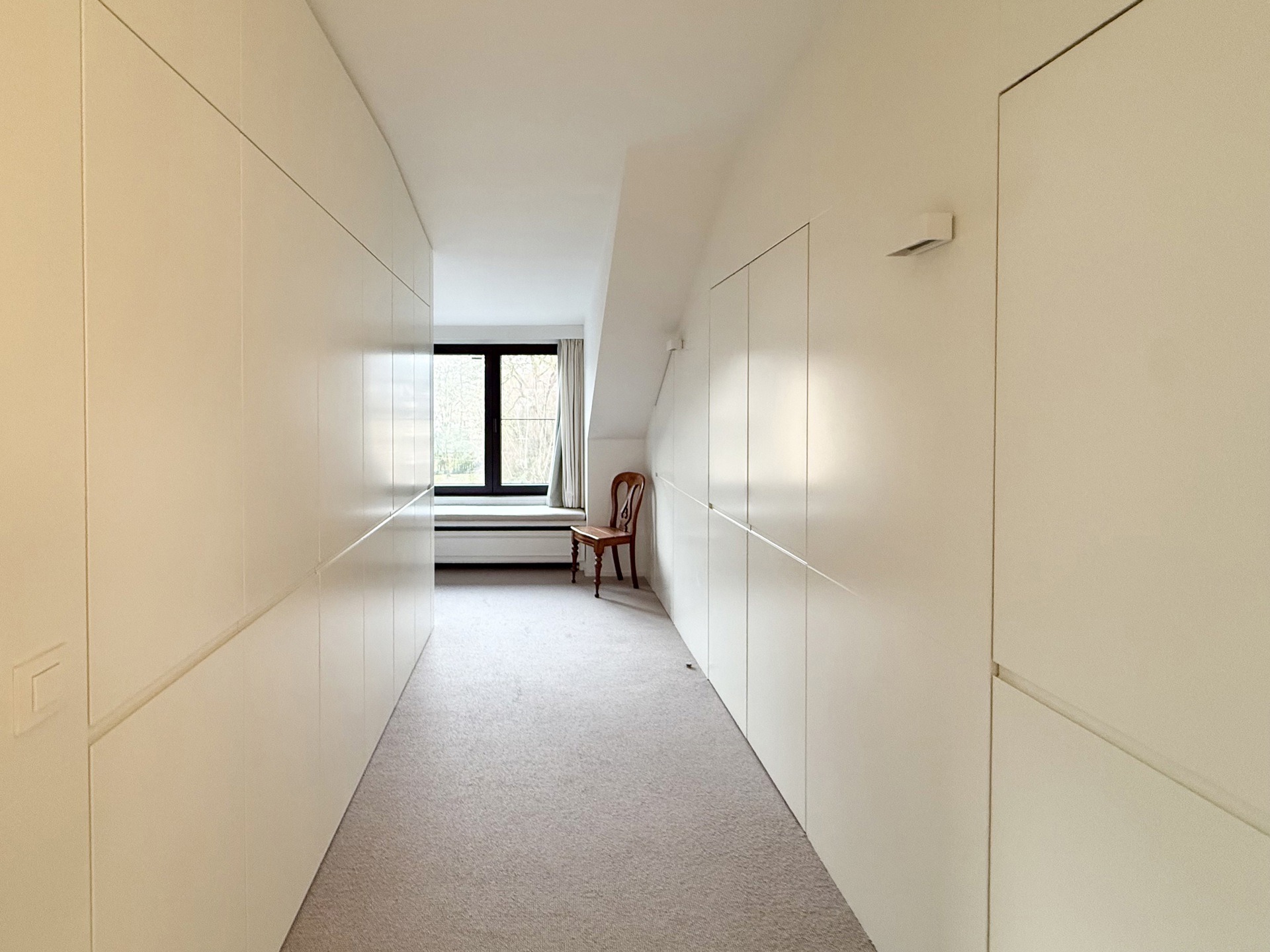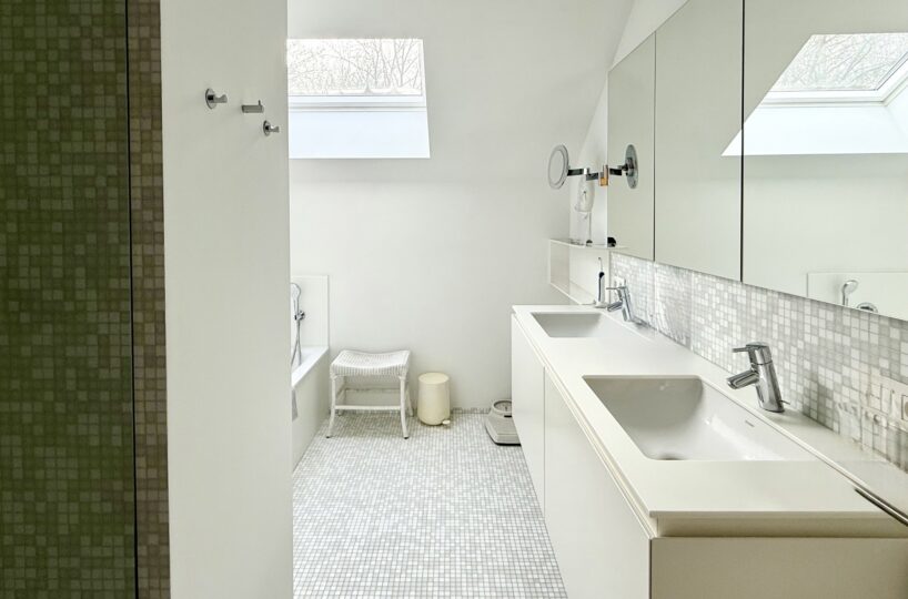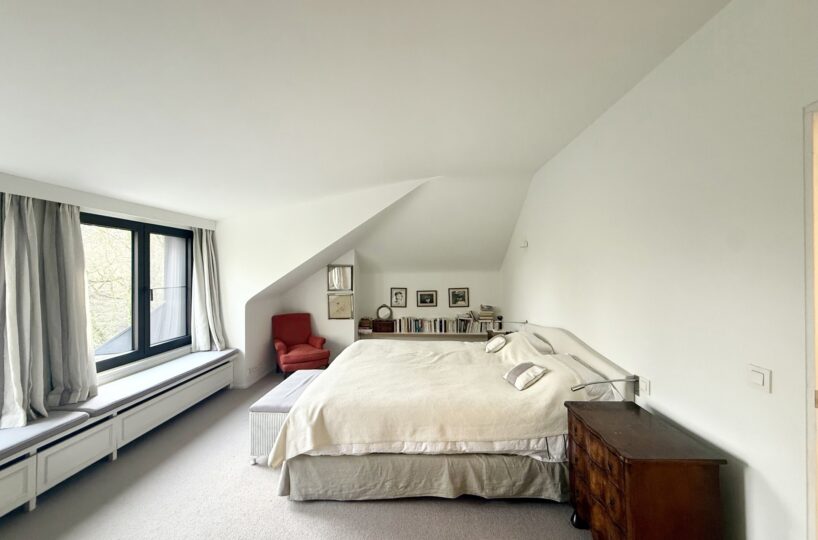 A l’étage supérieur : Un agréable hall de nuit. Une chambre parentale (30m2) avec rangements sur-mesure et vue sur le parc. Une salle de bain (bain, douche, double lavabo). Un WC individuel. Un vaste dressing sur-mesure avec haut niveau de finitions. Une chambre (15m2).