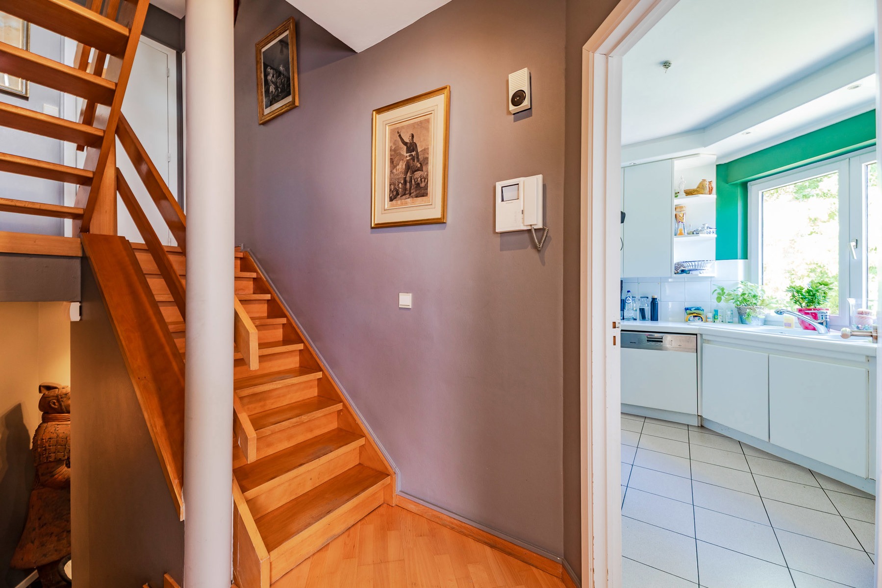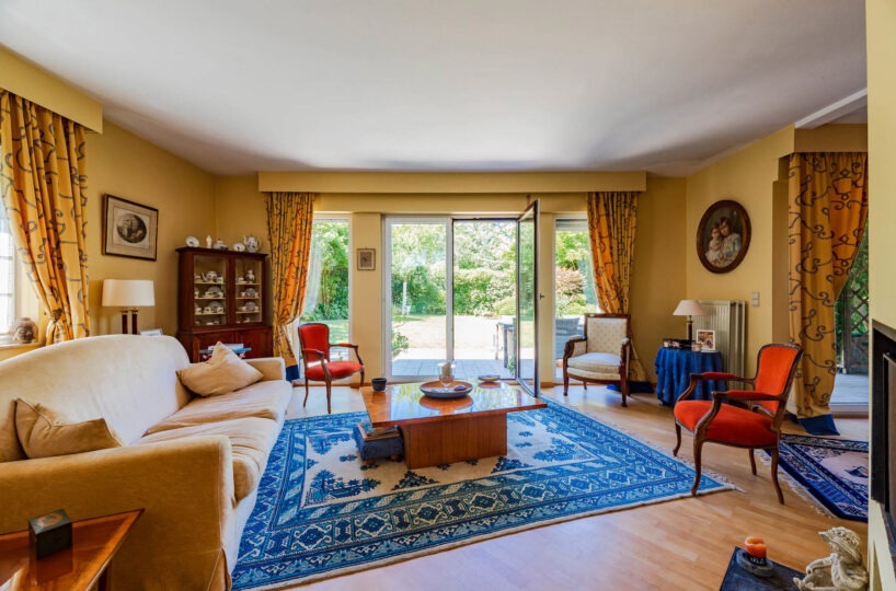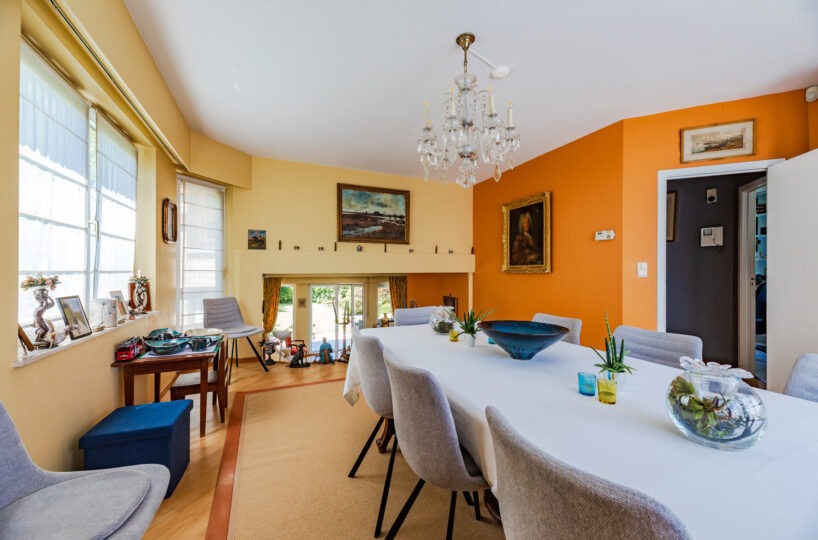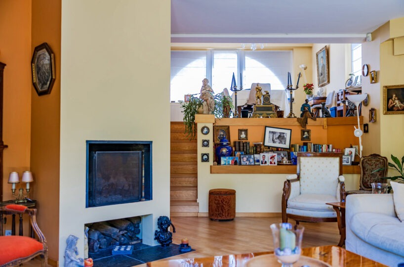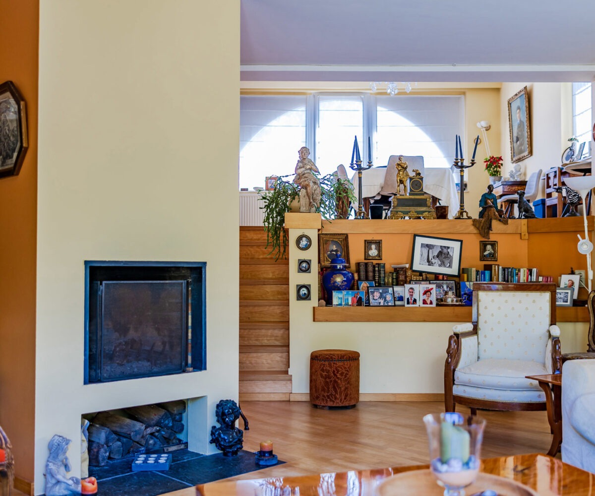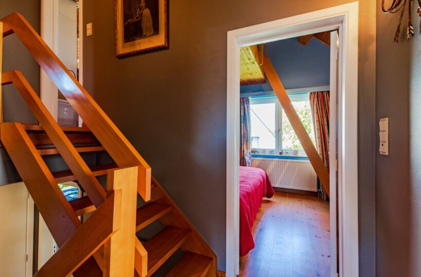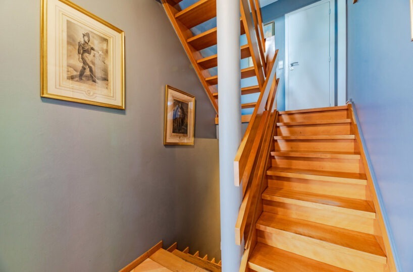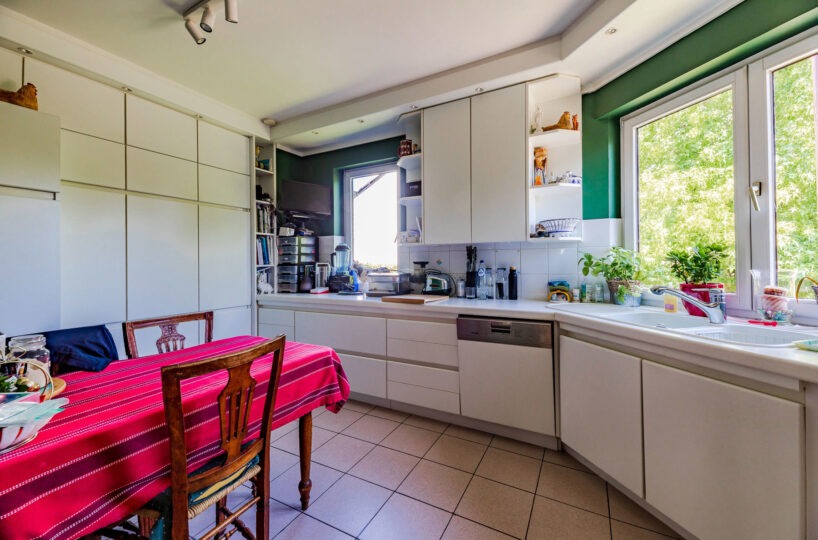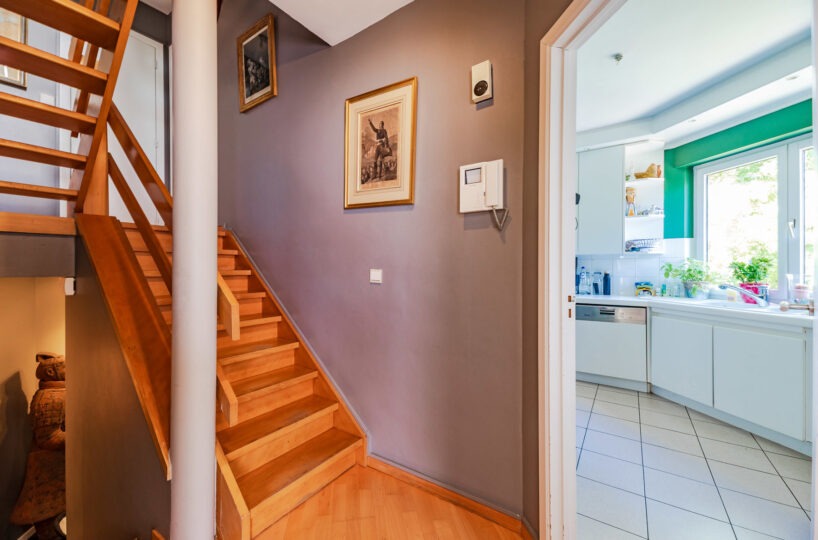 – Au rez-de-chaussée : Un hall d’entrée avec vestiaire et wc invité, un agréable salon (avec feu ouvert) ayant un accès à la terrasse et au jardin. A l’entre-étage, une salle à manger et une cuisine.