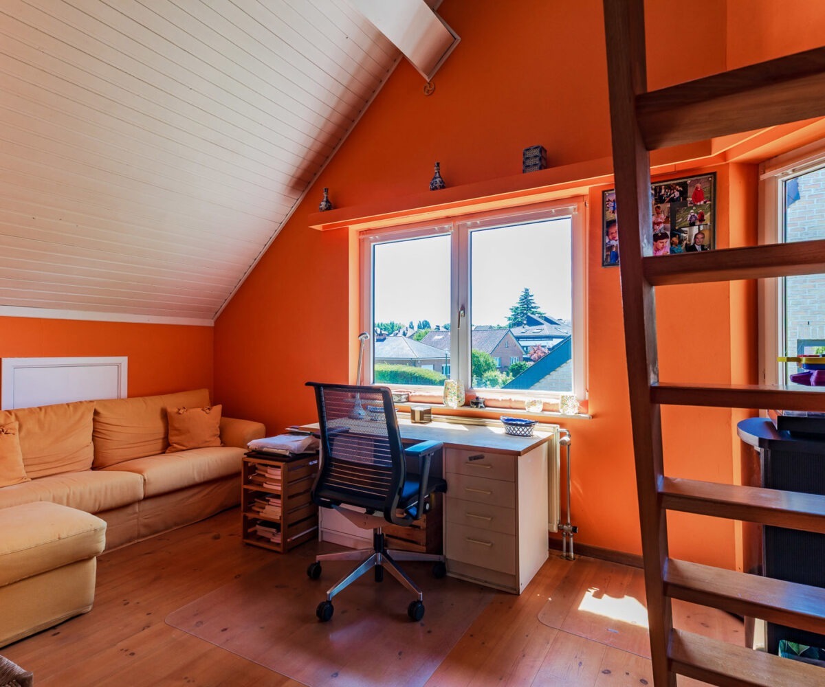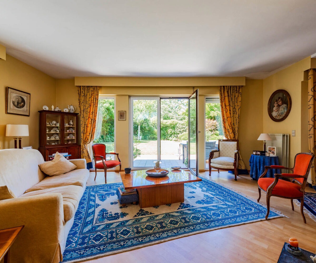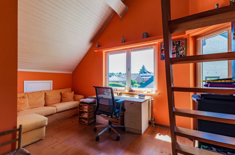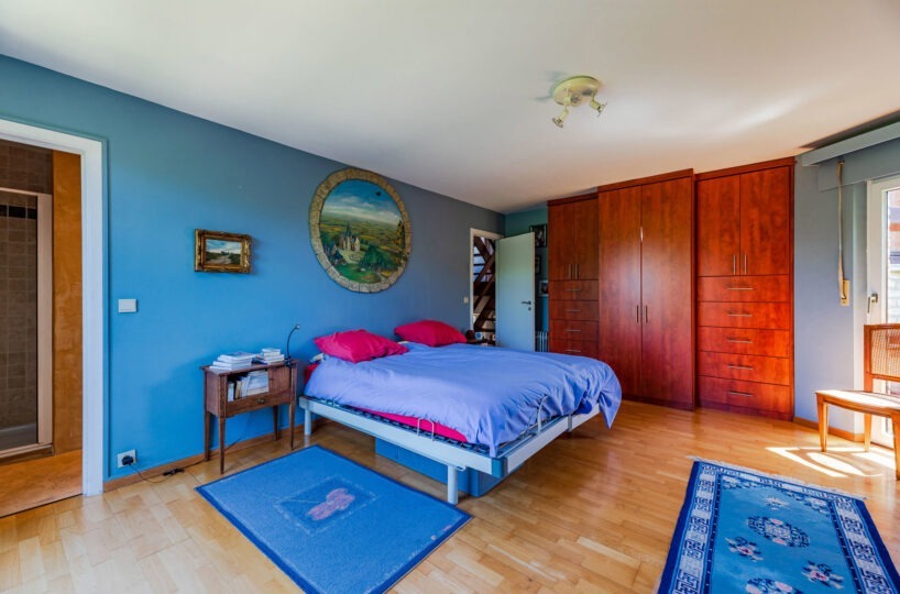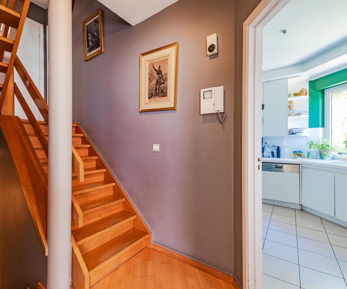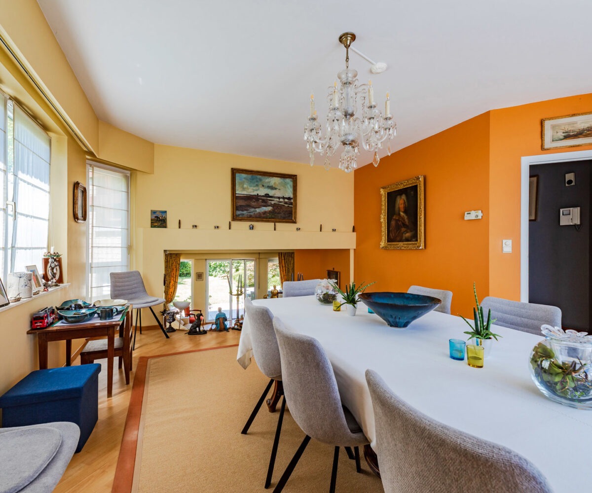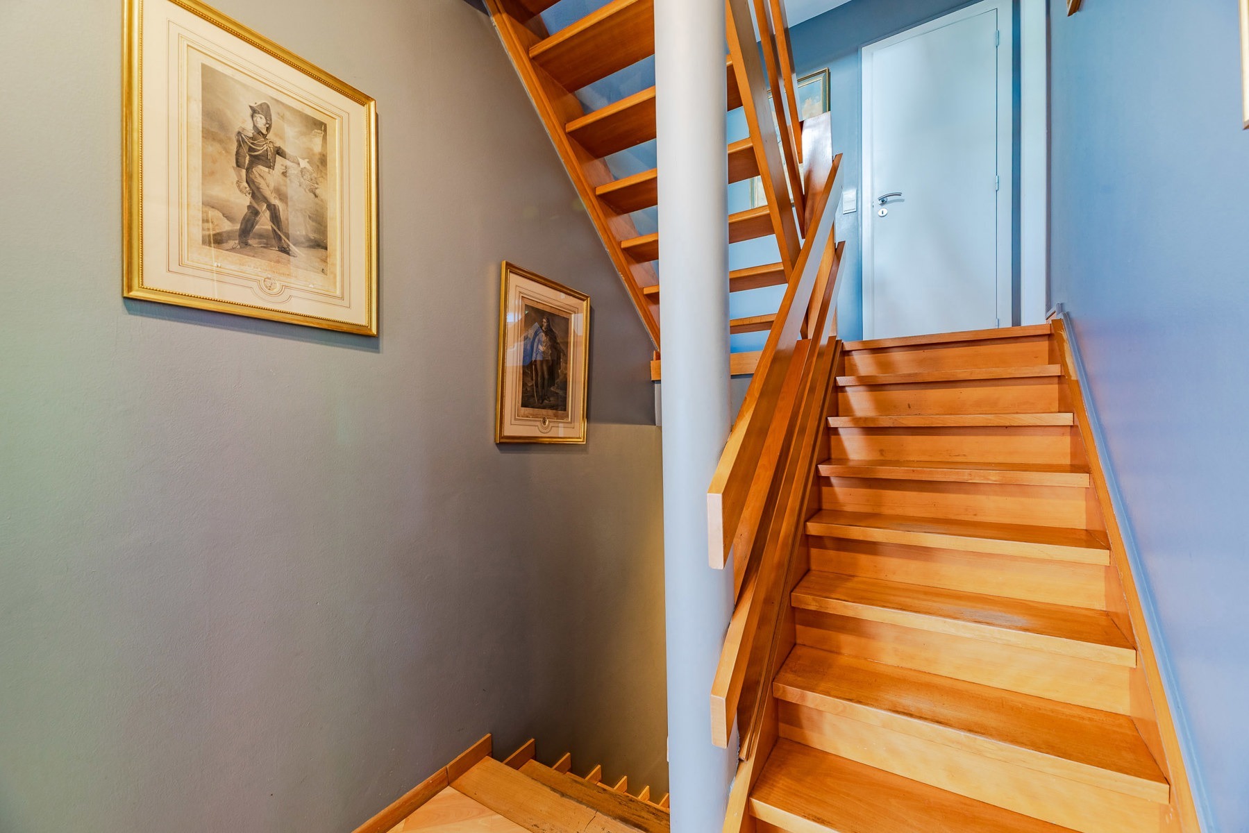 – Au rez-de-chaussée : Un hall d’entrée avec vestiaire et wc invité, un agréable salon (avec feu ouvert) ayant un accès à la terrasse et au jardin. A l’entre-étage, une salle à manger et une cuisine.