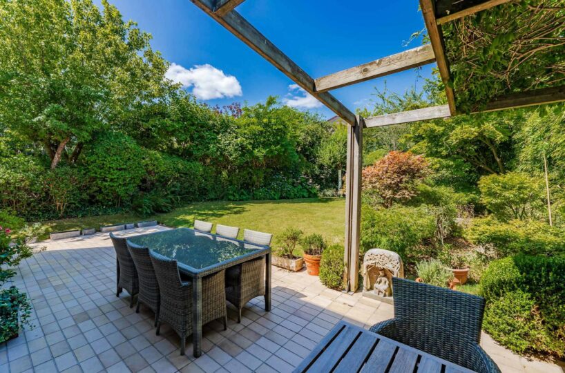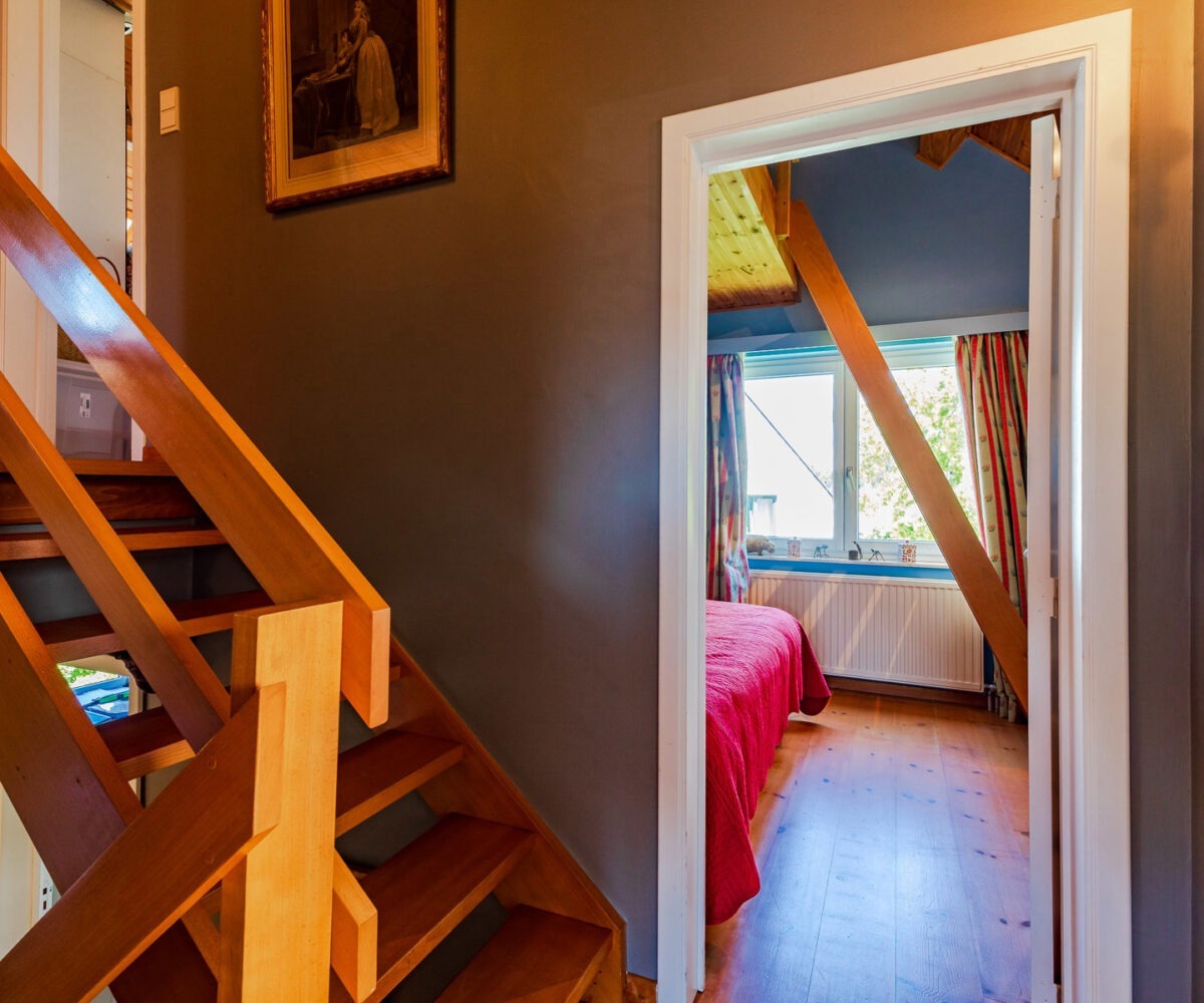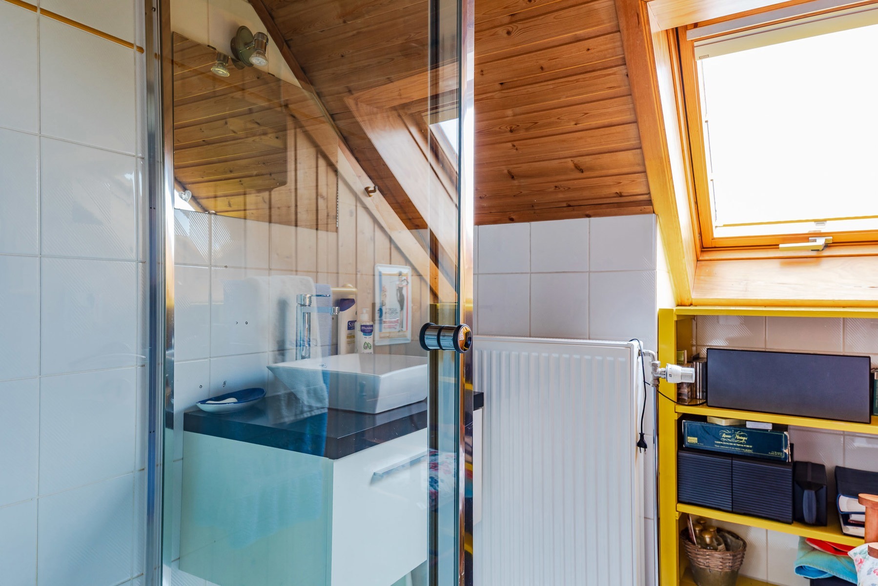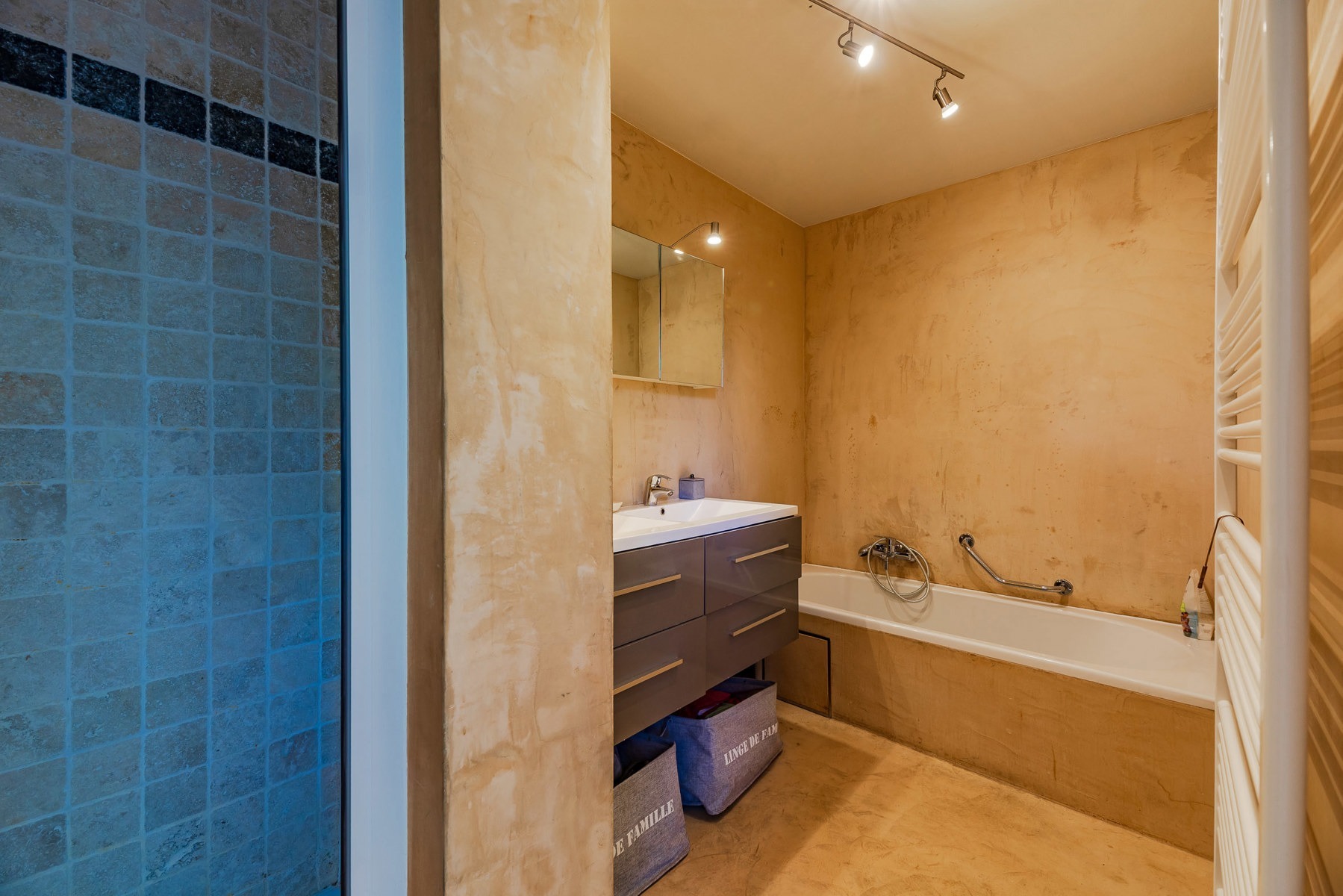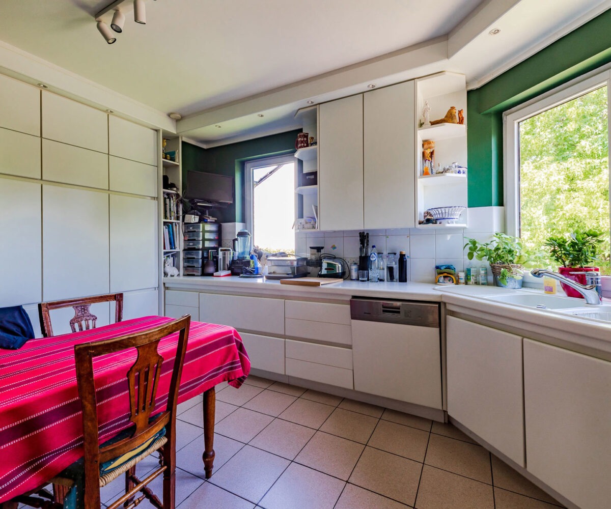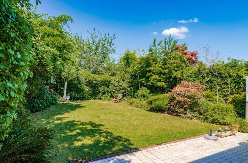 – Au rez-de-chaussée : Un hall d’entrée avec vestiaire et wc invité, un agréable salon (avec feu ouvert) ayant un accès à la terrasse et au jardin. A l’entre-étage, une salle à manger et une cuisine.