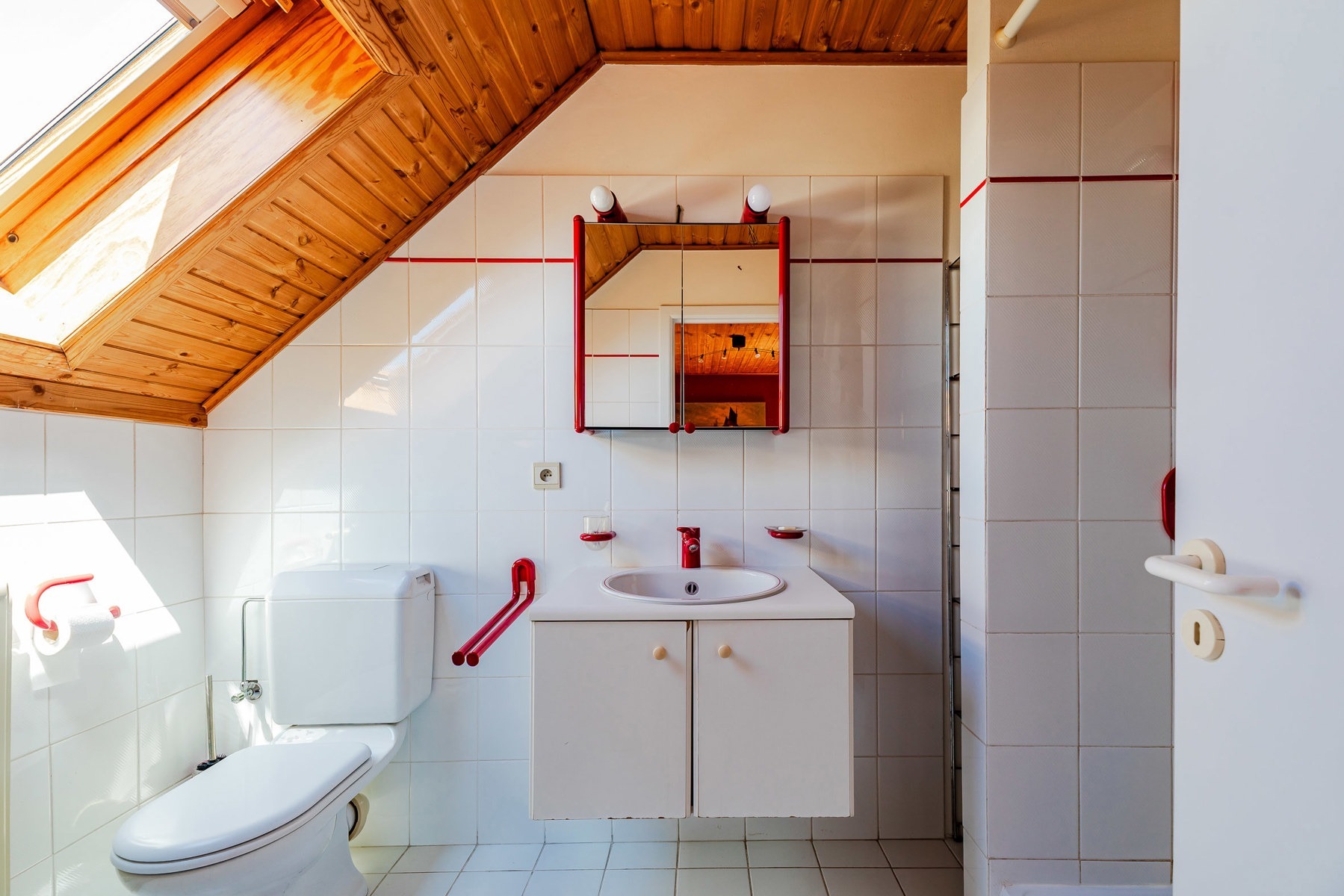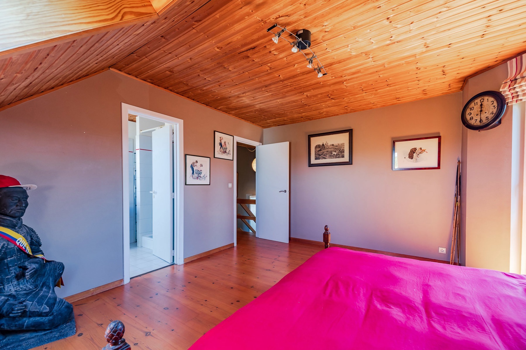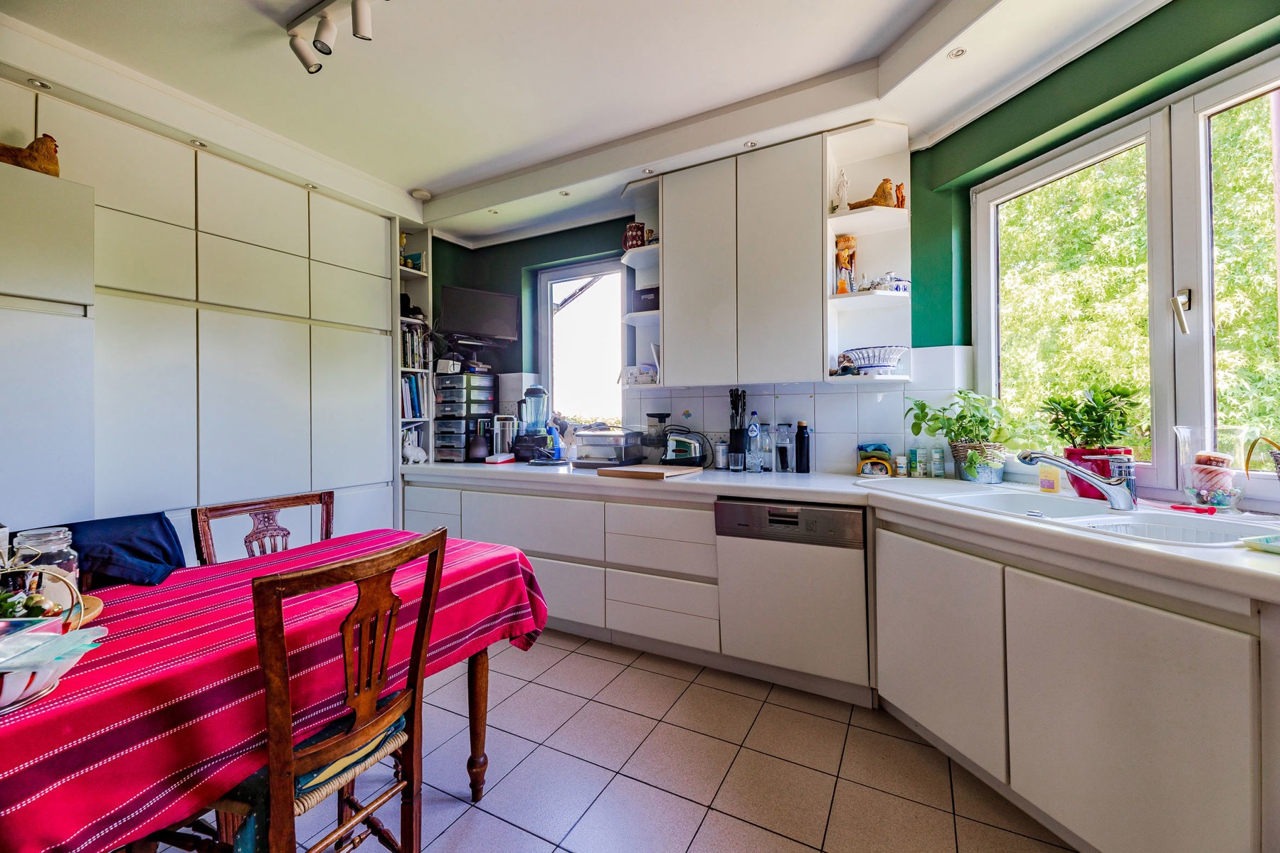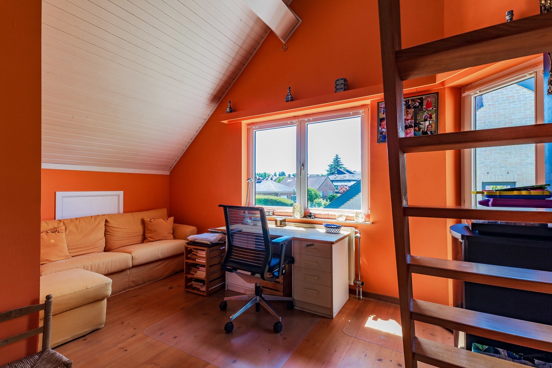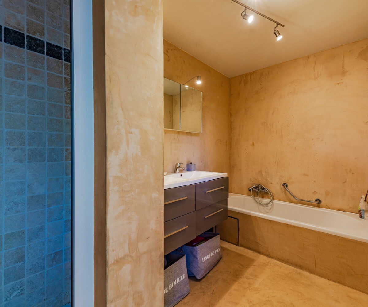 – Au rez-de-chaussée : Un hall d’entrée avec vestiaire et wc invité, un agréable salon (avec feu ouvert) ayant un accès à la terrasse et au jardin. A l’entre-étage, une salle à manger et une cuisine.