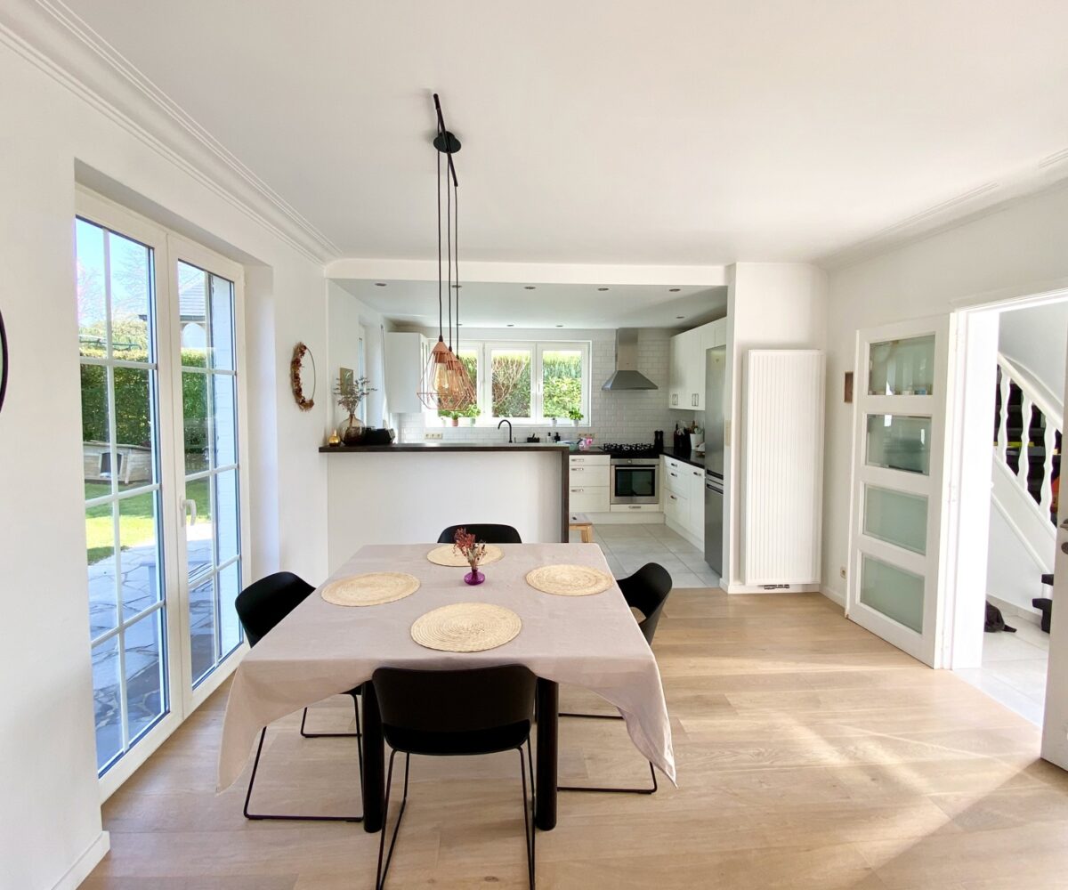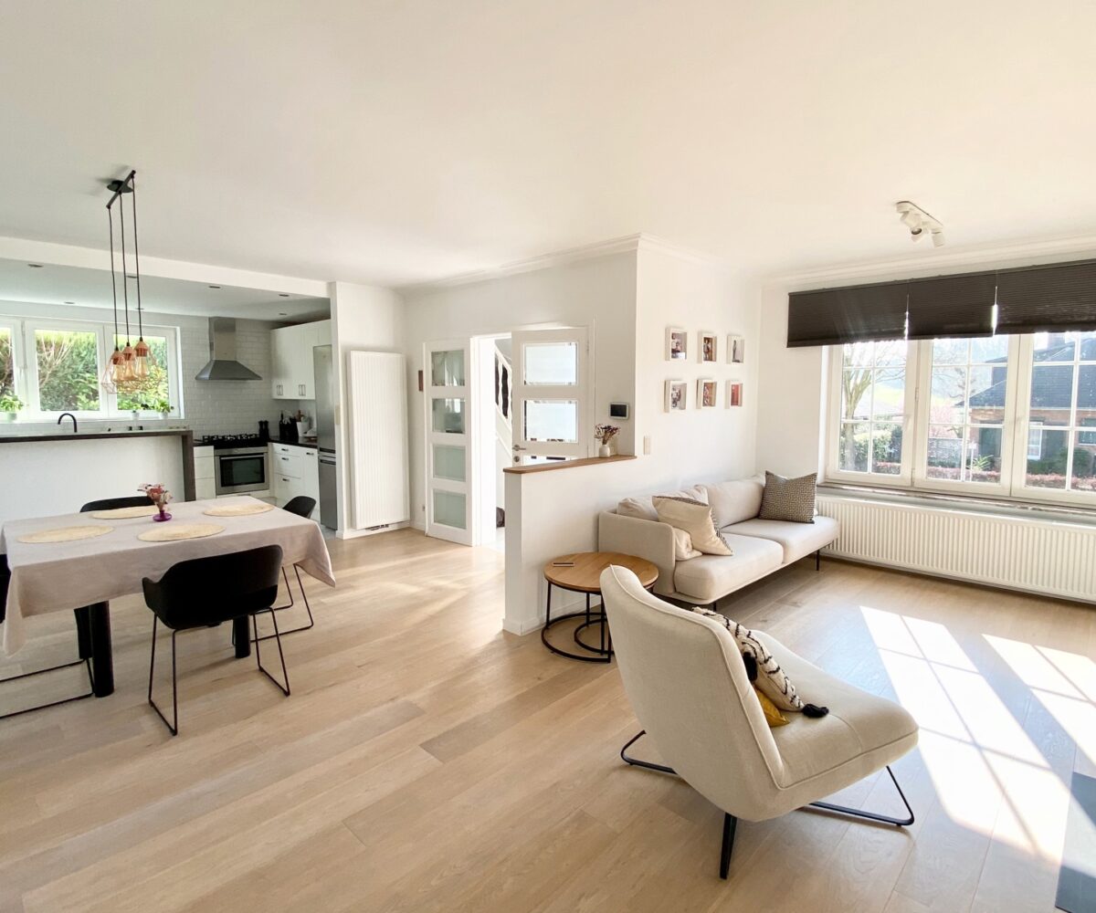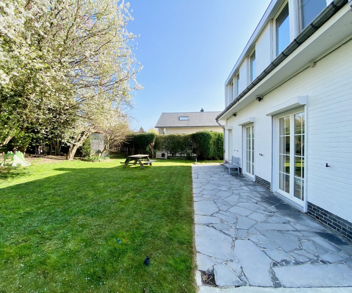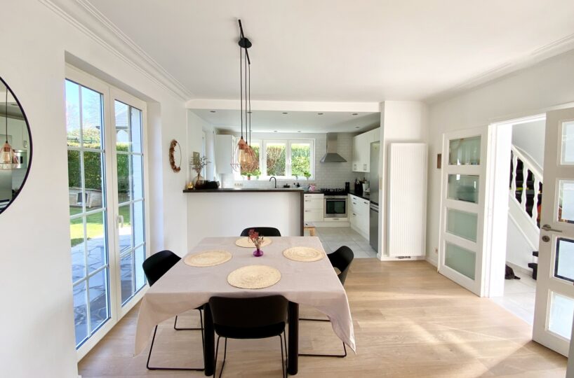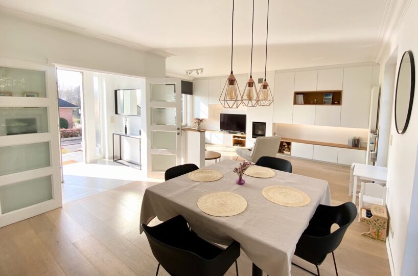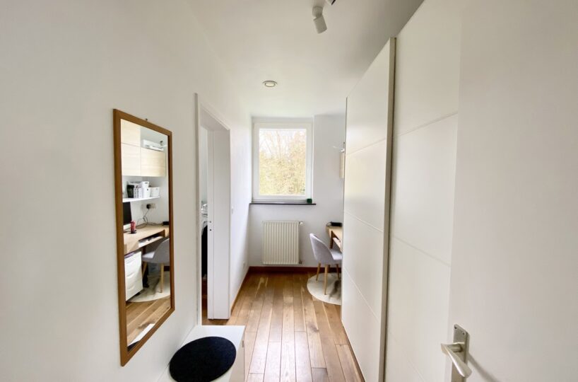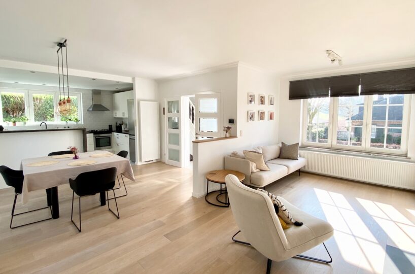 – Au rez de chausée (+-60m2) : Hall d’entrée avec vestiaire et wc invité, agréable séjour/espace salle à manger, cuisine ouverte entièrement équipée. Cassette (Stuv) et nombreux rangements encastrés. L’ensemble donne accès à la terrasse (+- 30m2) et sur un beau jardin paysager avec peu de vis à vis.