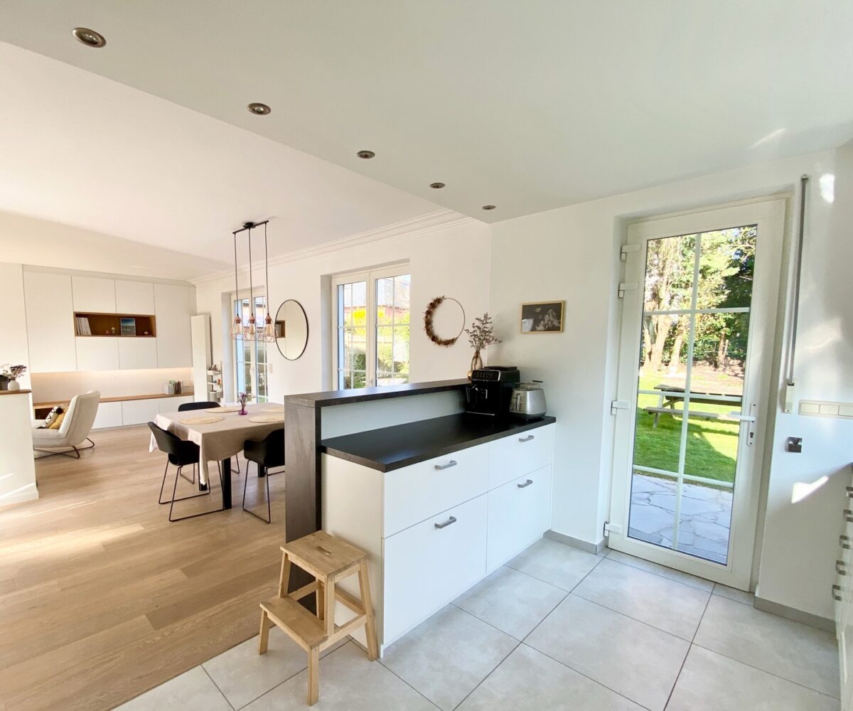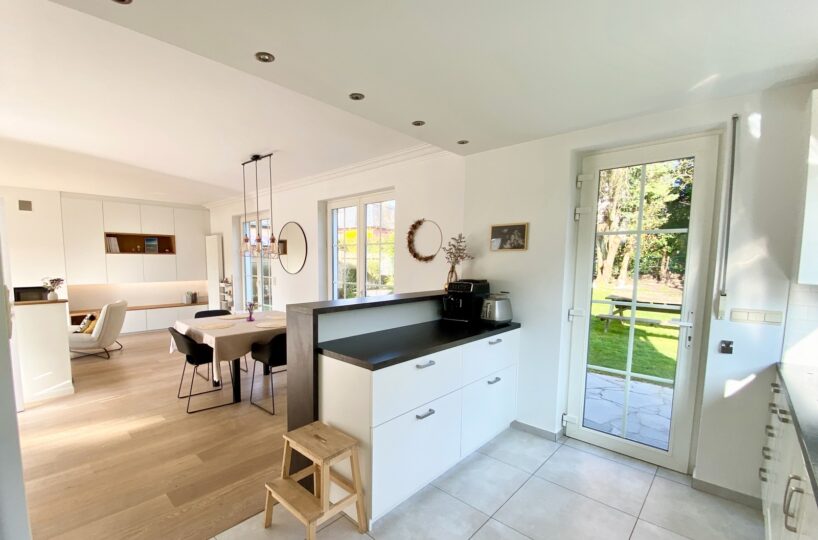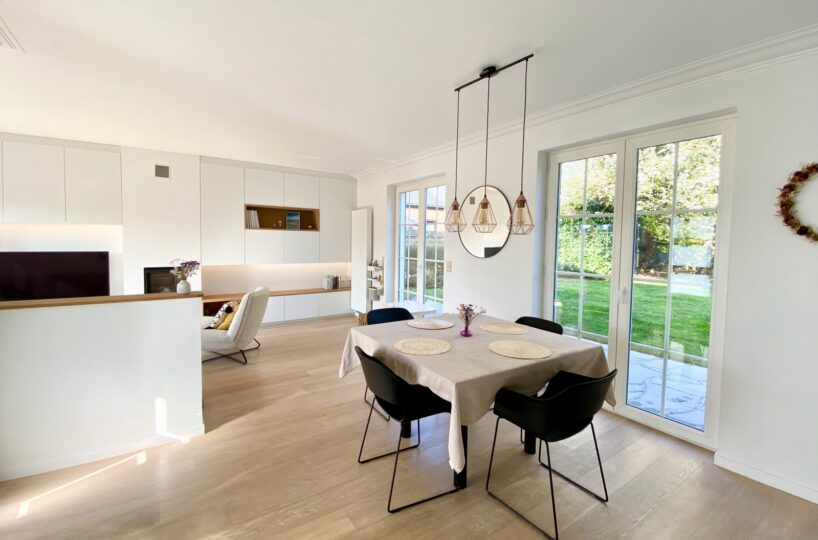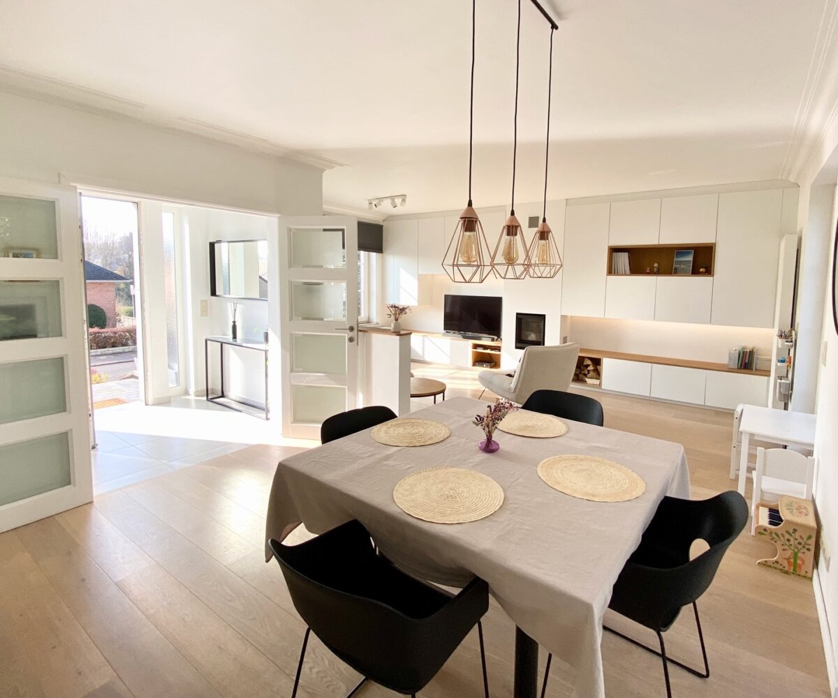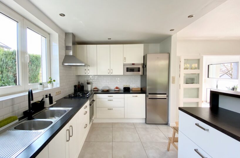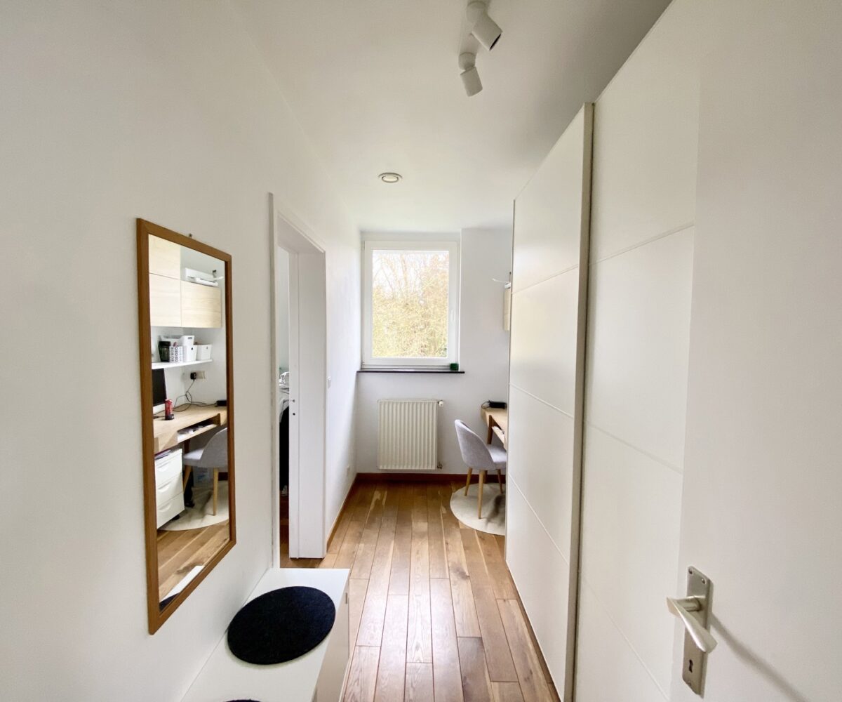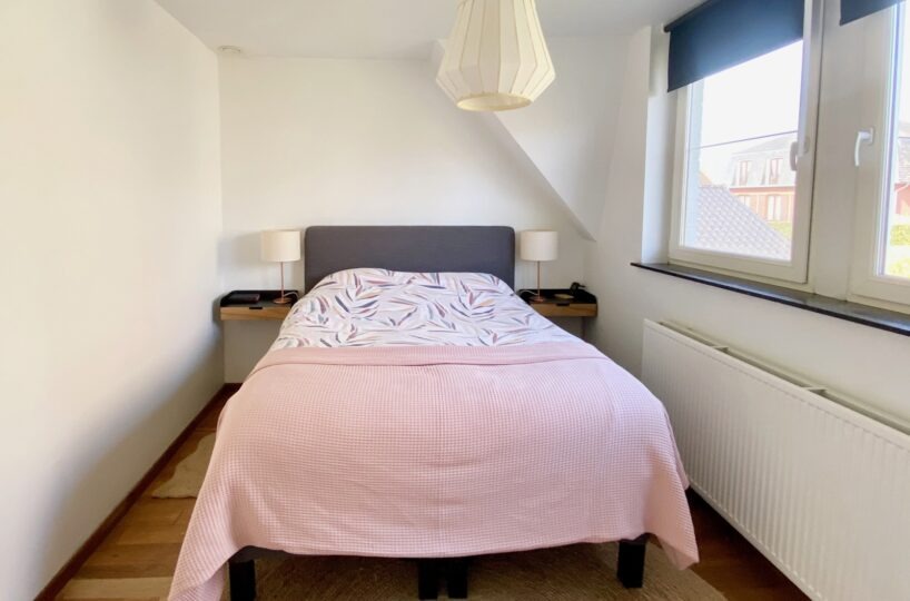 – Au rez de chausée (+-60m2) : Hall d’entrée avec vestiaire et wc invité, agréable séjour/espace salle à manger, cuisine ouverte entièrement équipée. Cassette (Stuv) et nombreux rangements encastrés. L’ensemble donne accès à la terrasse (+- 30m2) et sur un beau jardin paysager avec peu de vis à vis.