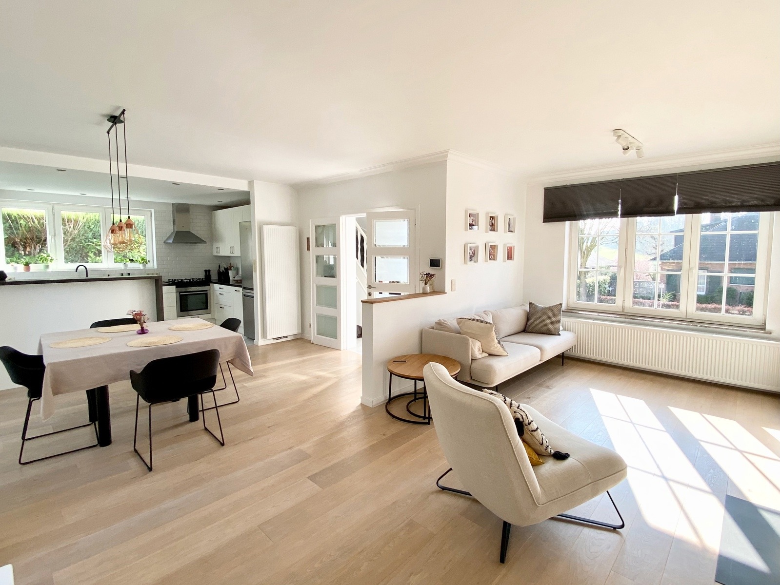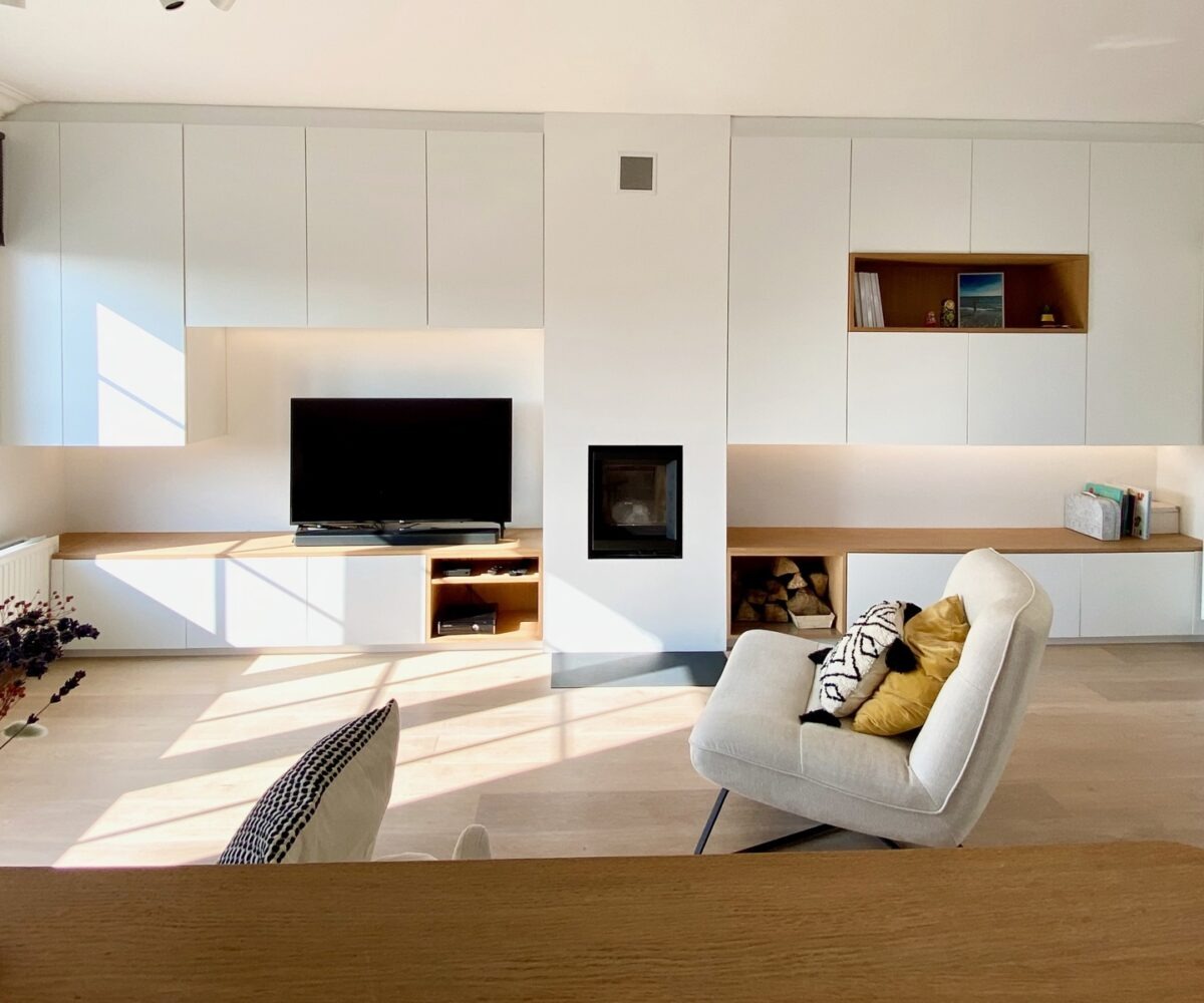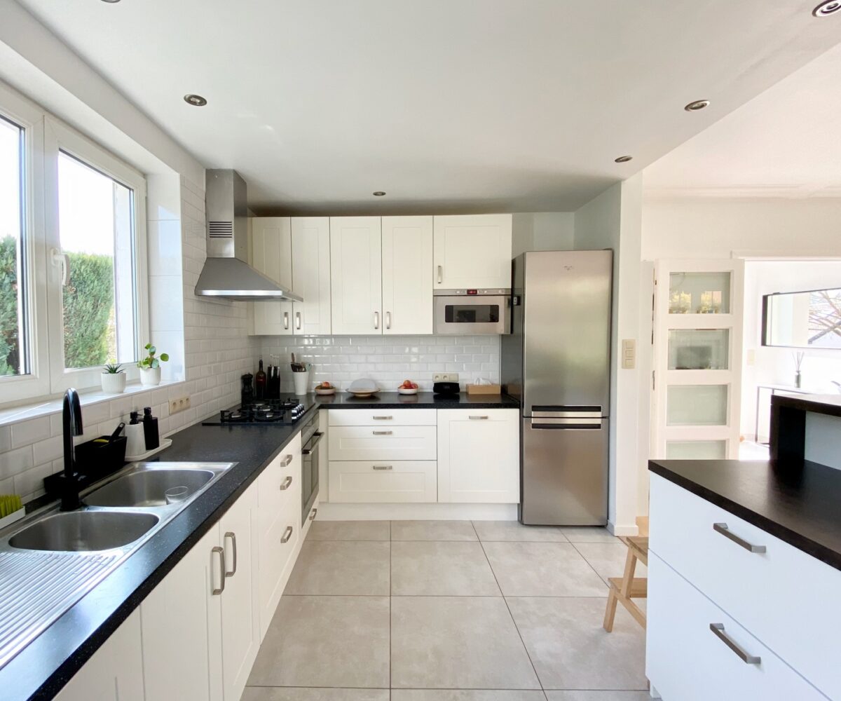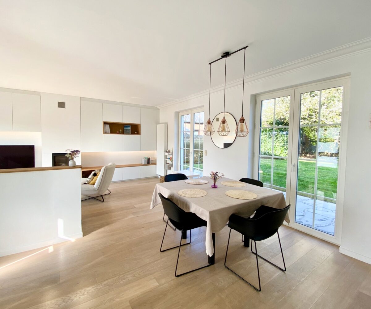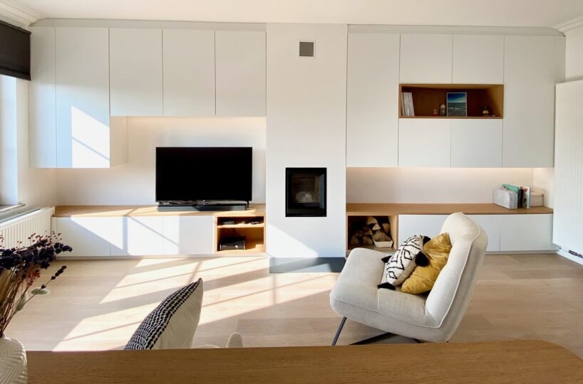 – Au rez de chausée (+-60m2) : Hall d’entrée avec vestiaire et wc invité, agréable séjour/espace salle à manger, cuisine ouverte entièrement équipée. Cassette (Stuv) et nombreux rangements encastrés. L’ensemble donne accès à la terrasse (+- 30m2) et sur un beau jardin paysager avec peu de vis à vis.