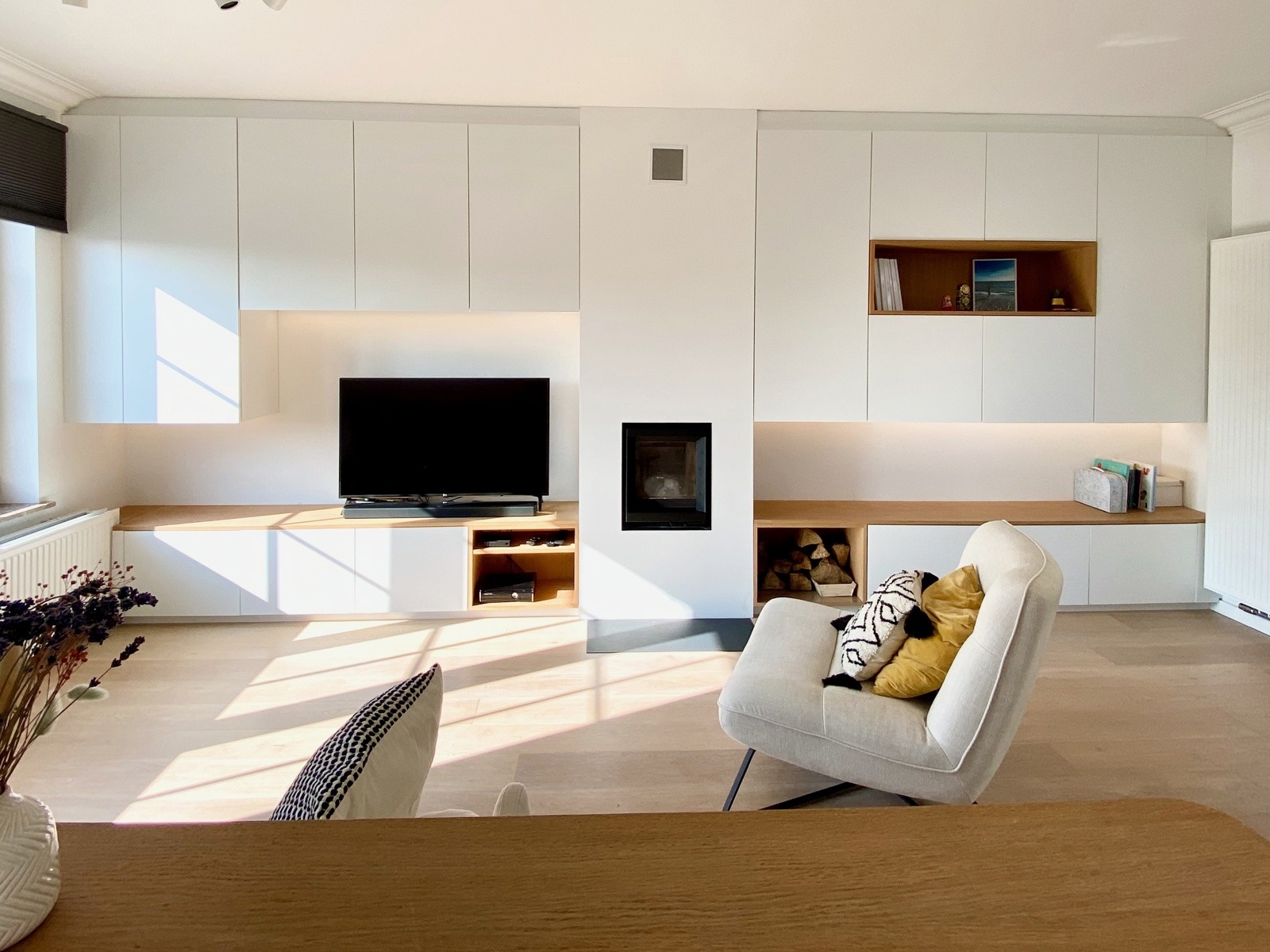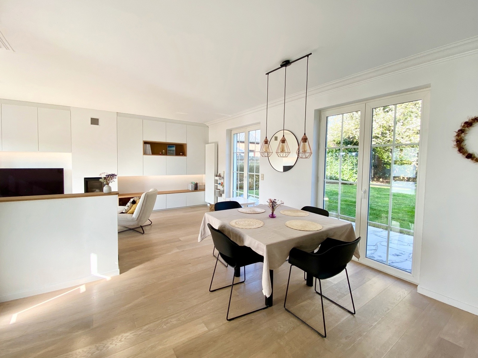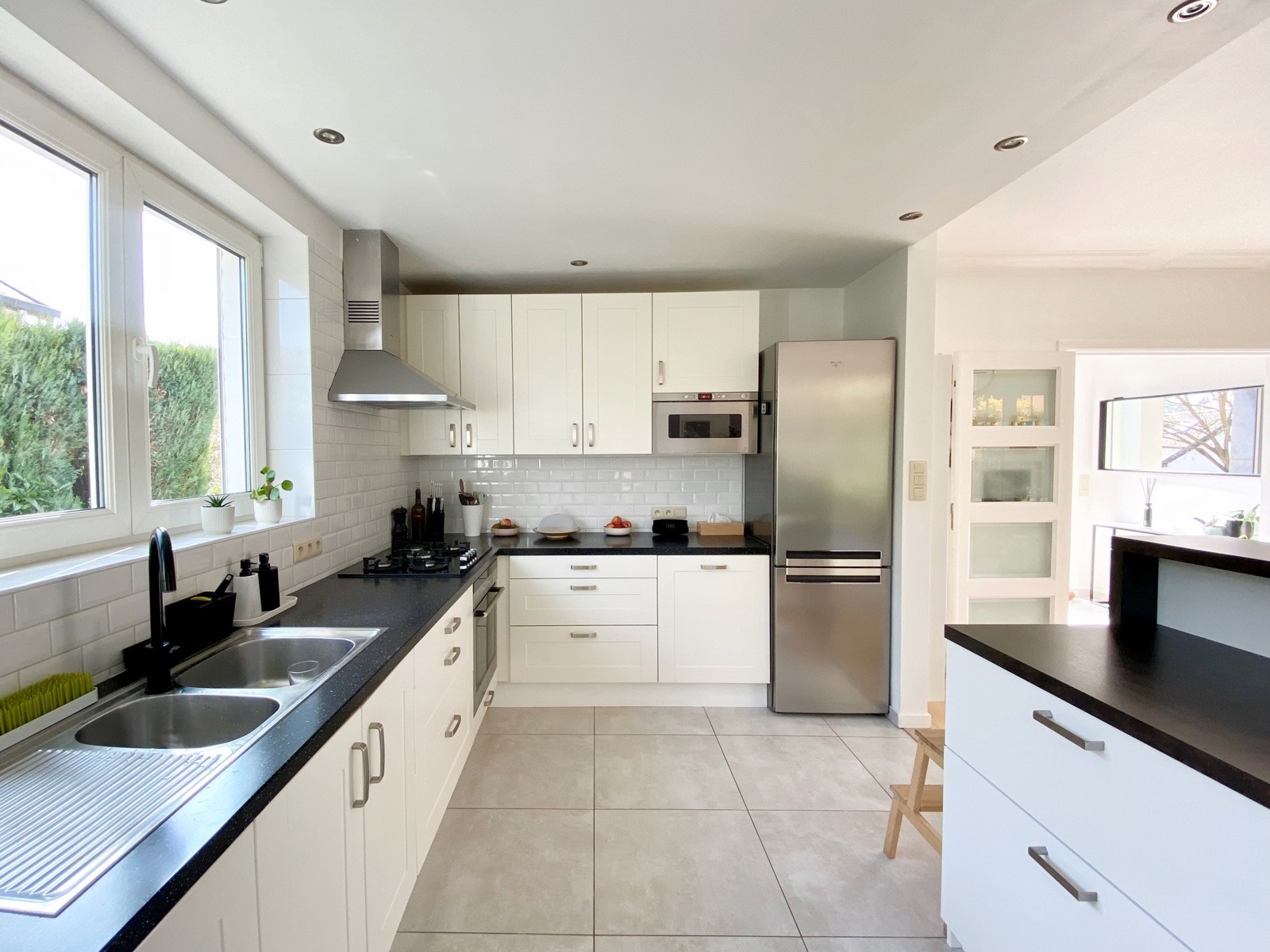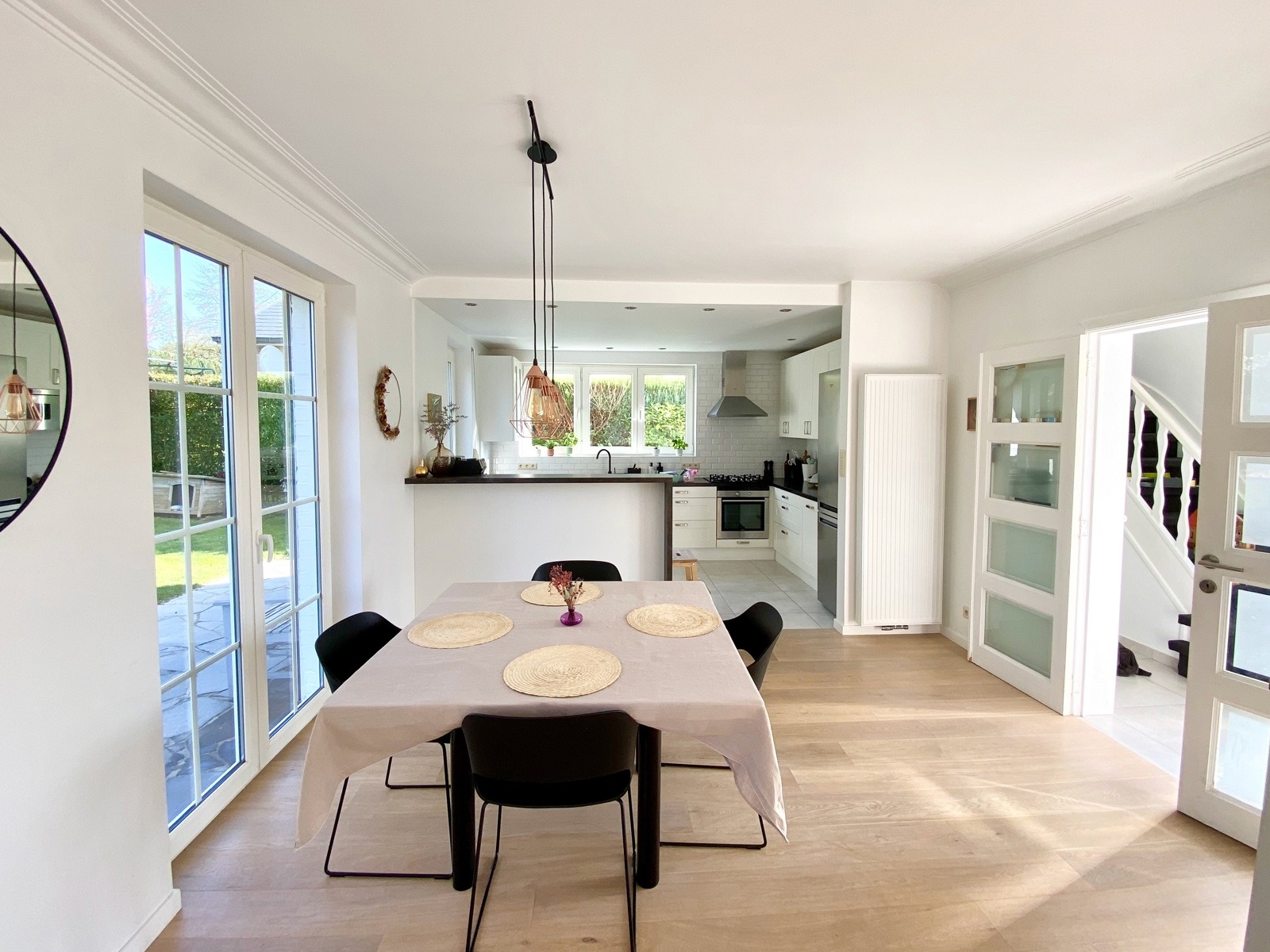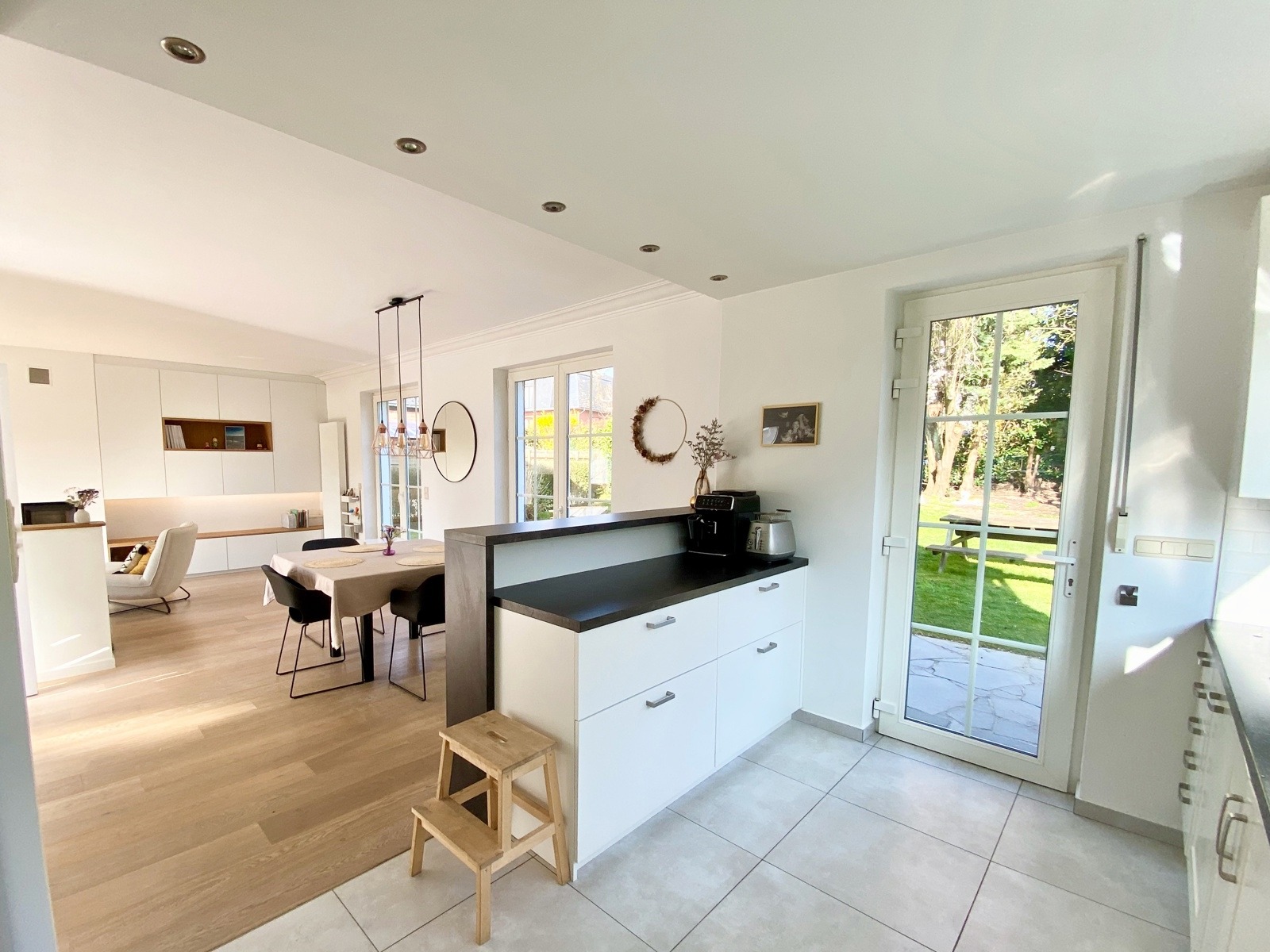 – Au rez de chausée (+-60m2) : Hall d’entrée avec vestiaire et wc invité, agréable séjour/espace salle à manger, cuisine ouverte entièrement équipée. Cassette (Stuv) et nombreux rangements encastrés. L’ensemble donne accès à la terrasse (+- 30m2) et sur un beau jardin paysager avec peu de vis à vis.