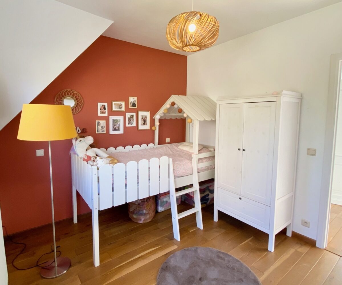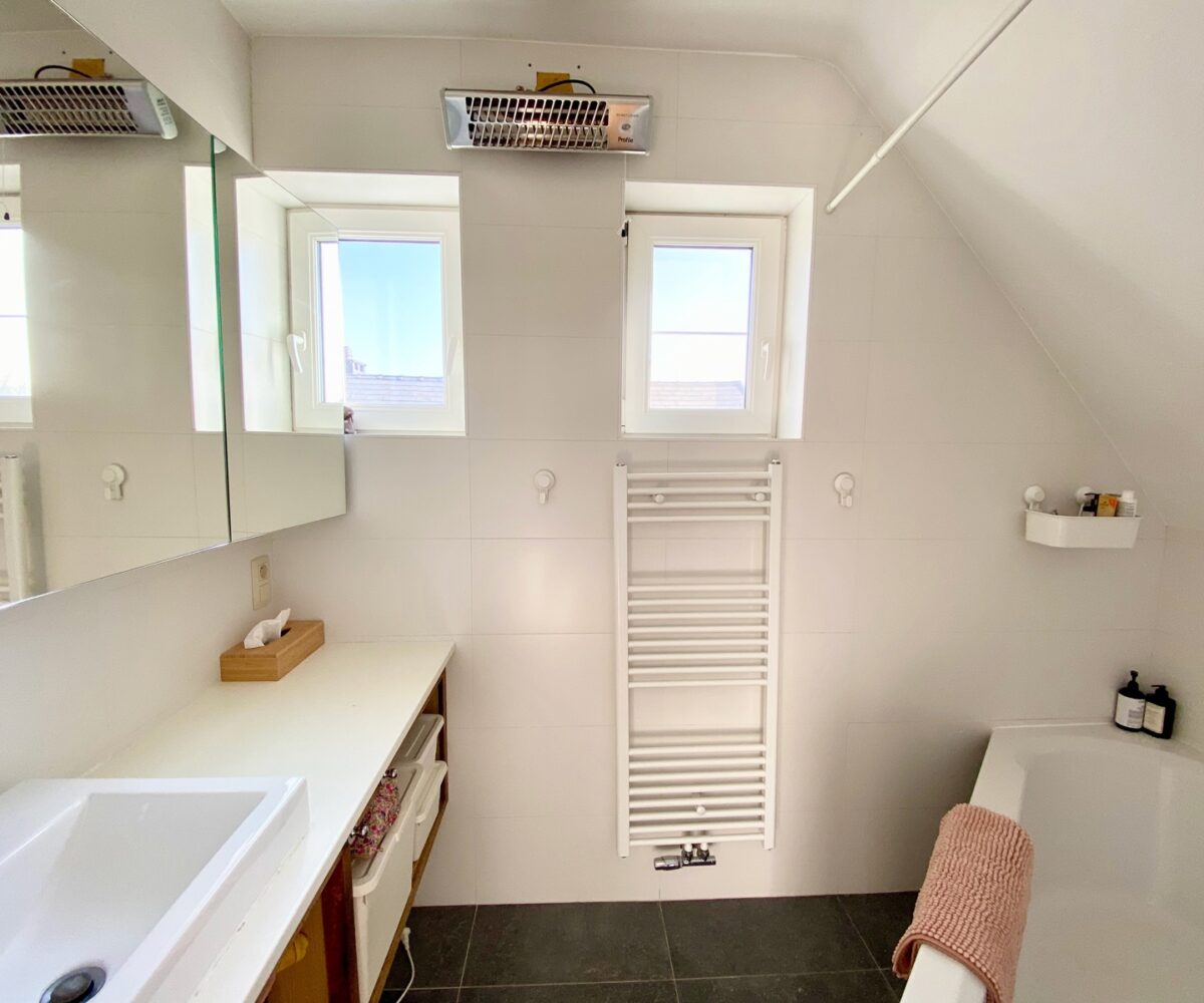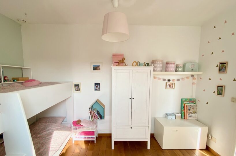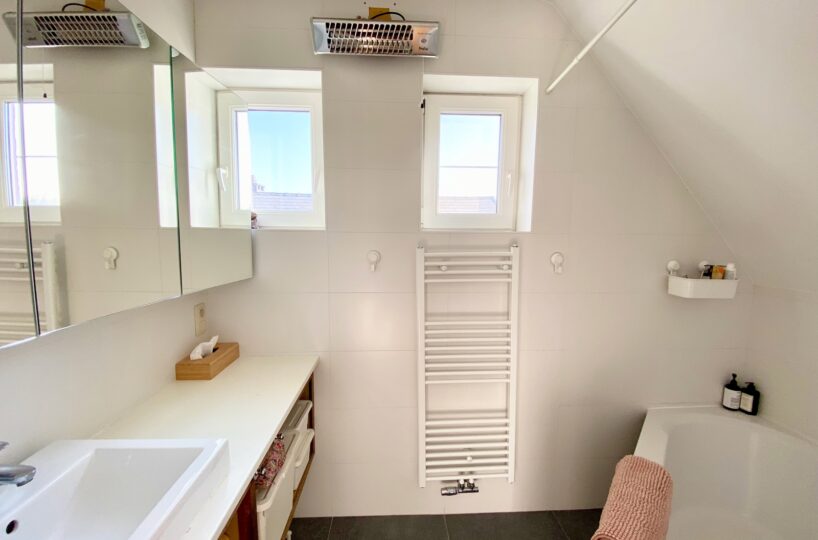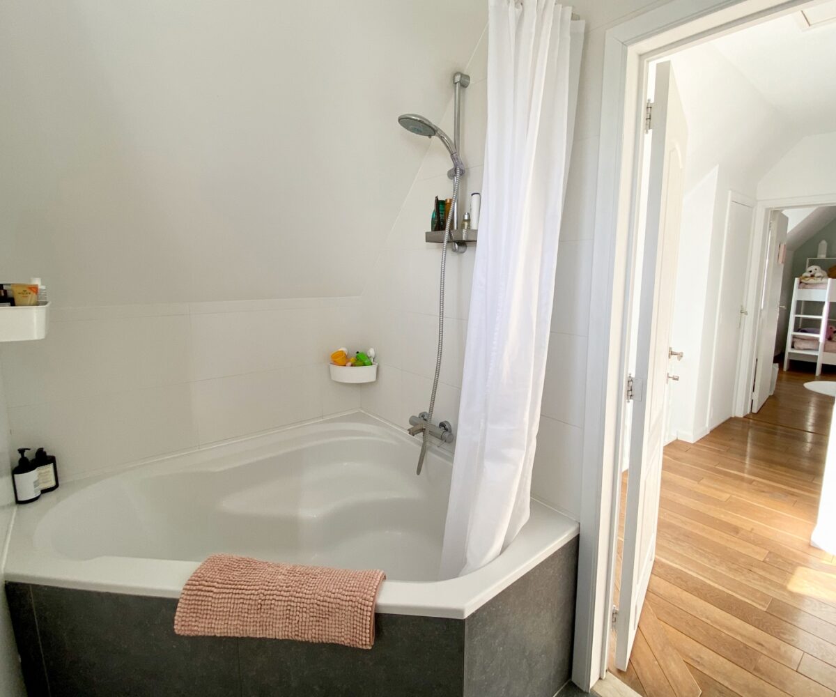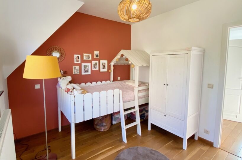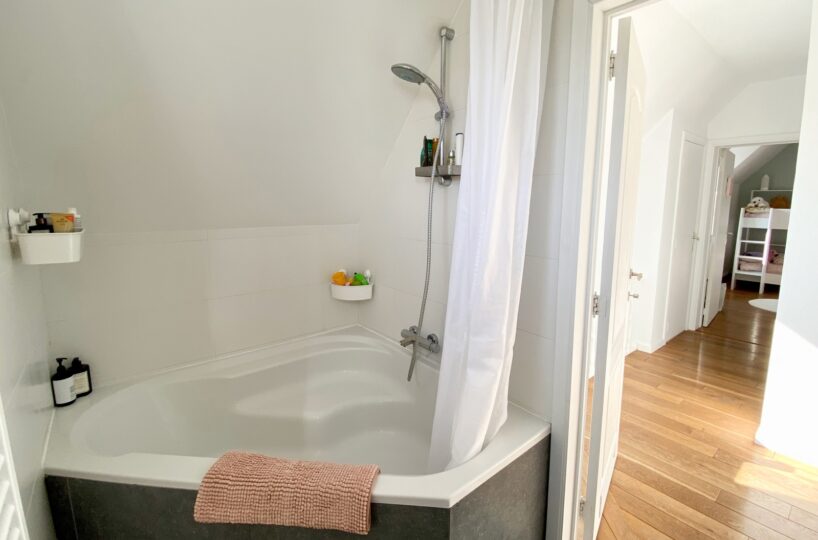 – A l’étage (+-50m2): Un hall de nuit, un bel espace parental (23m2) avec une chambre et un dressing/bureau attenant, deux jolies chambres d’enfant (10 et 9m2), une salle de bains ( large bain, douche dans le bain, double vasques ), toilette séparée.
