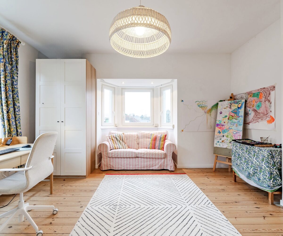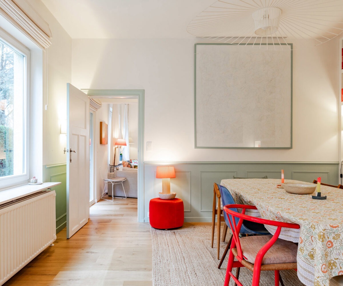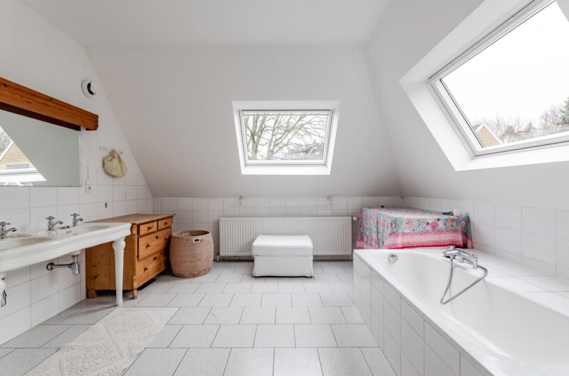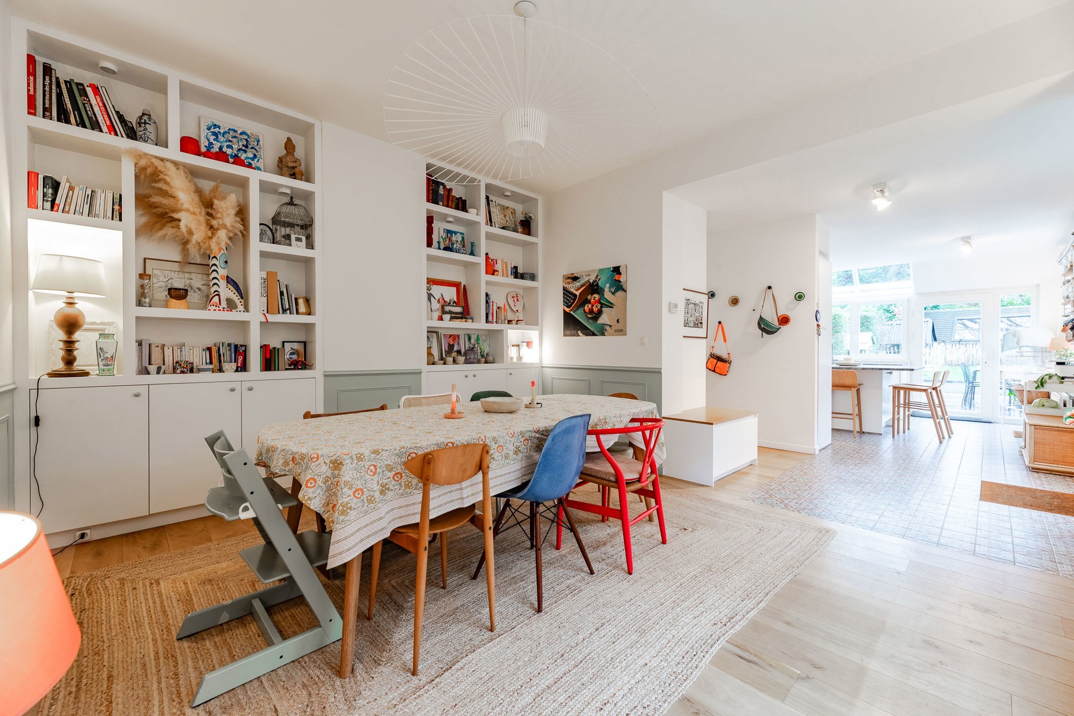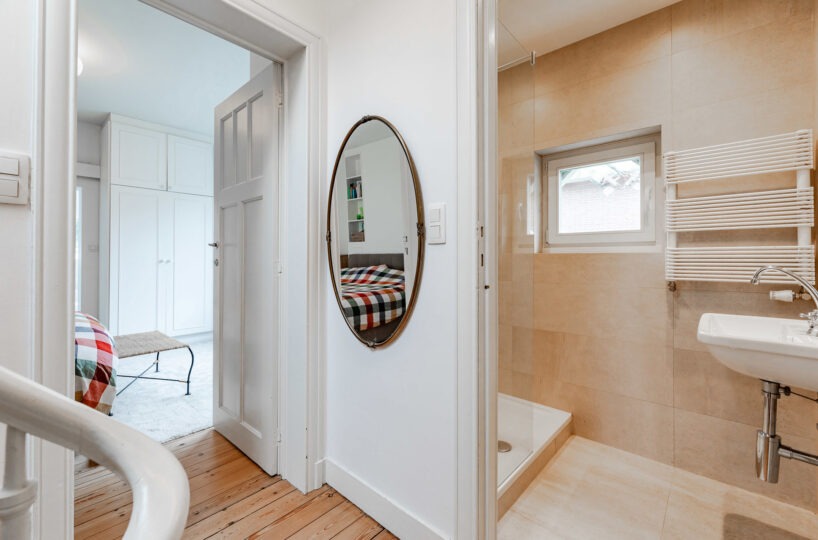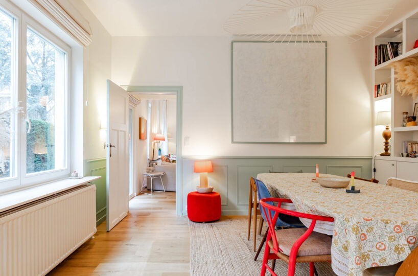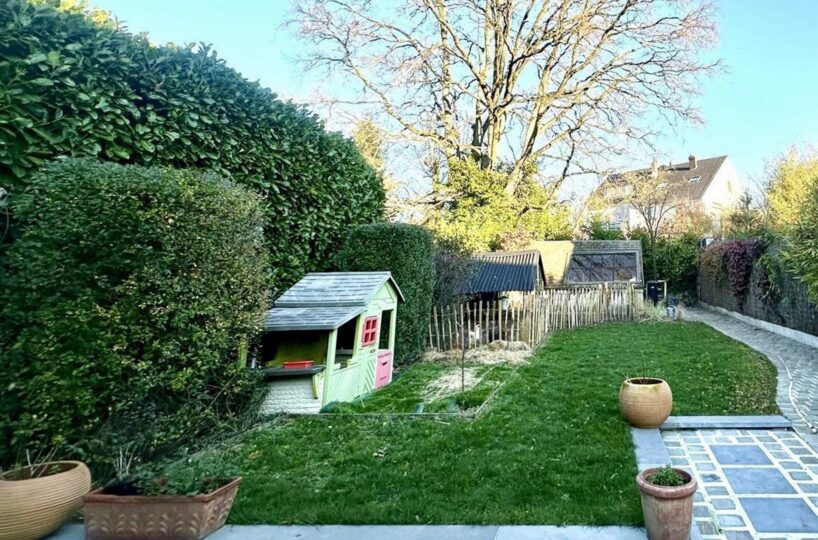 – Rez-de-chaussée : hall d’entrée avec vestiaire et wc invité. Agréable cuisine entièrement équipée avec ilôt central offrant une vue et un accès direct au jardin. Salle à manger avec rangements sur-mesure. Agréable salon avec cassette intégrée.