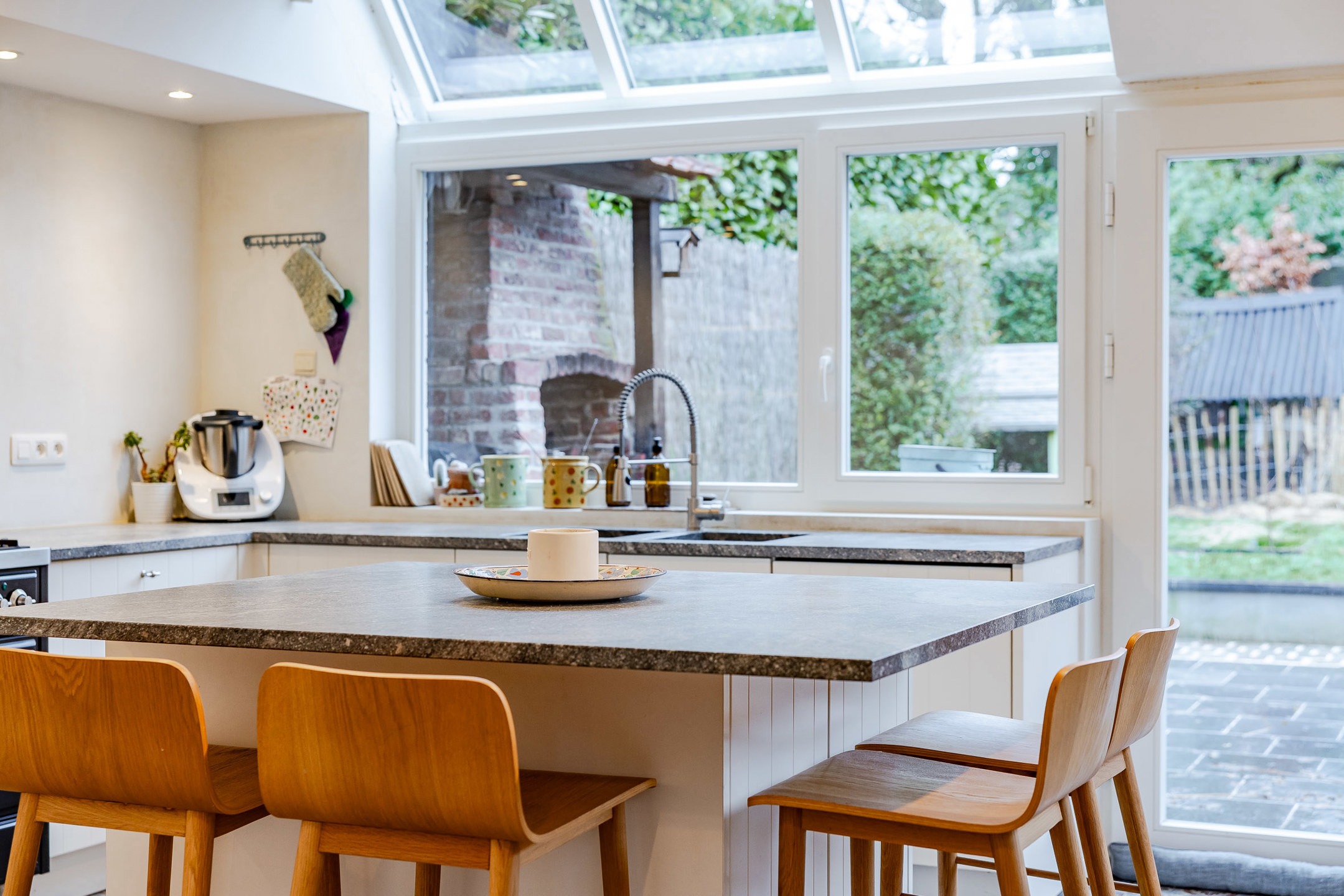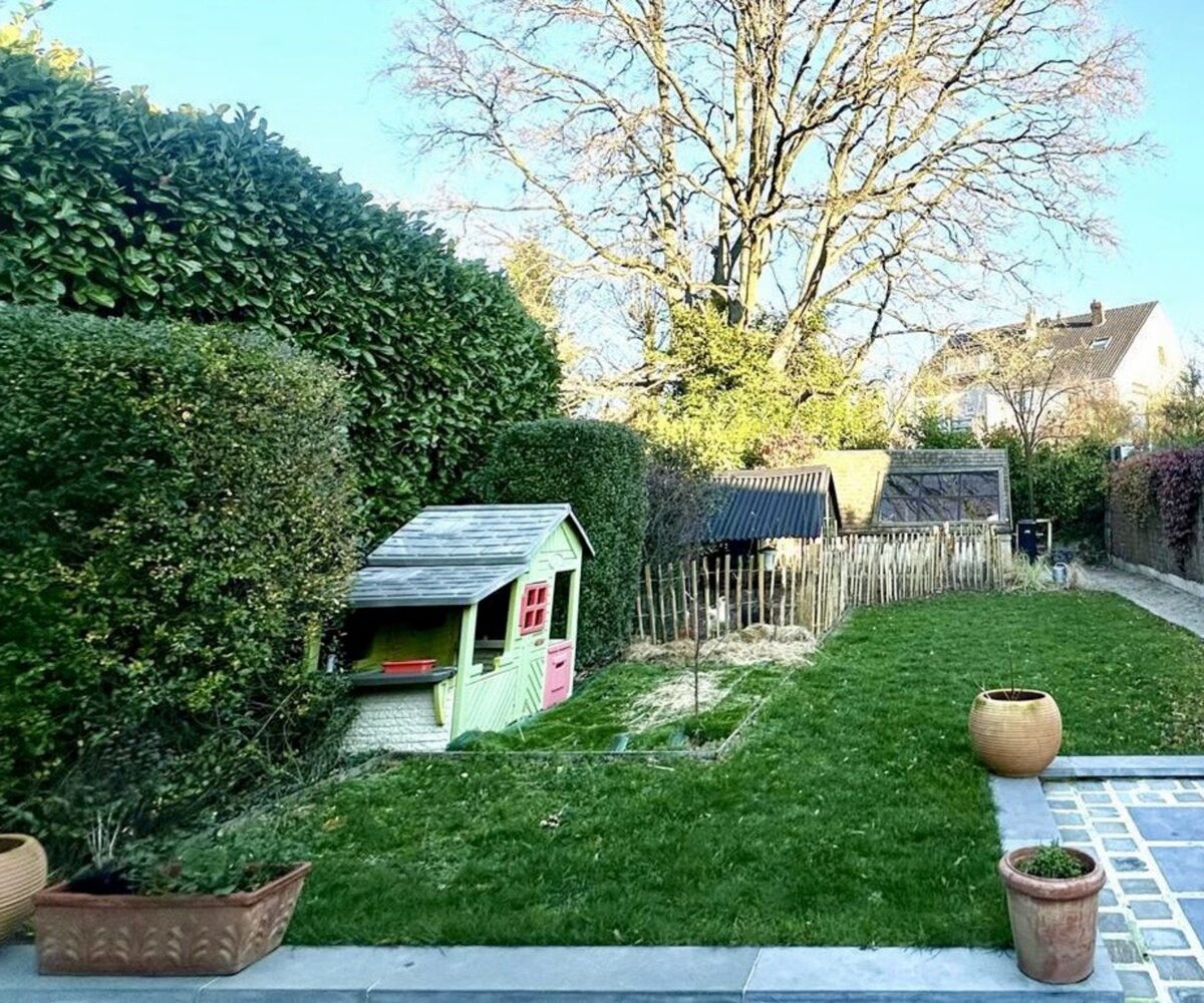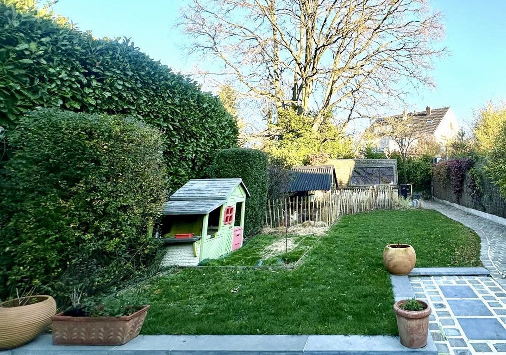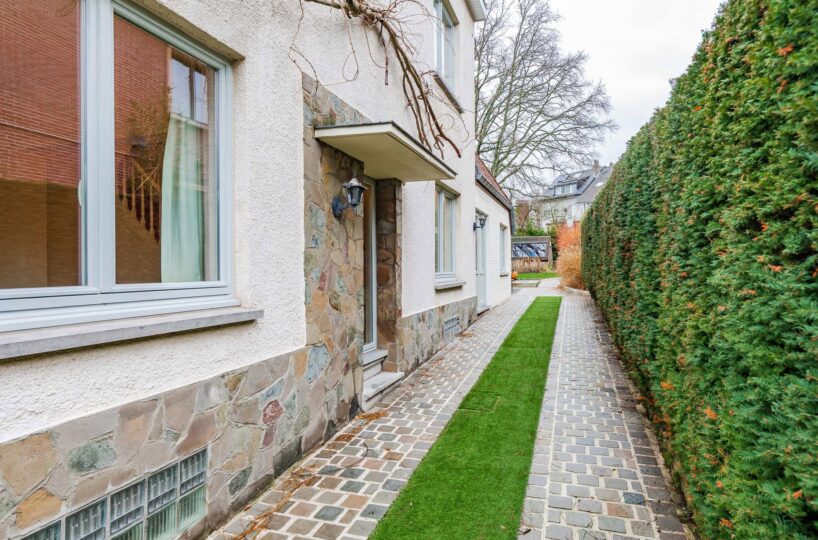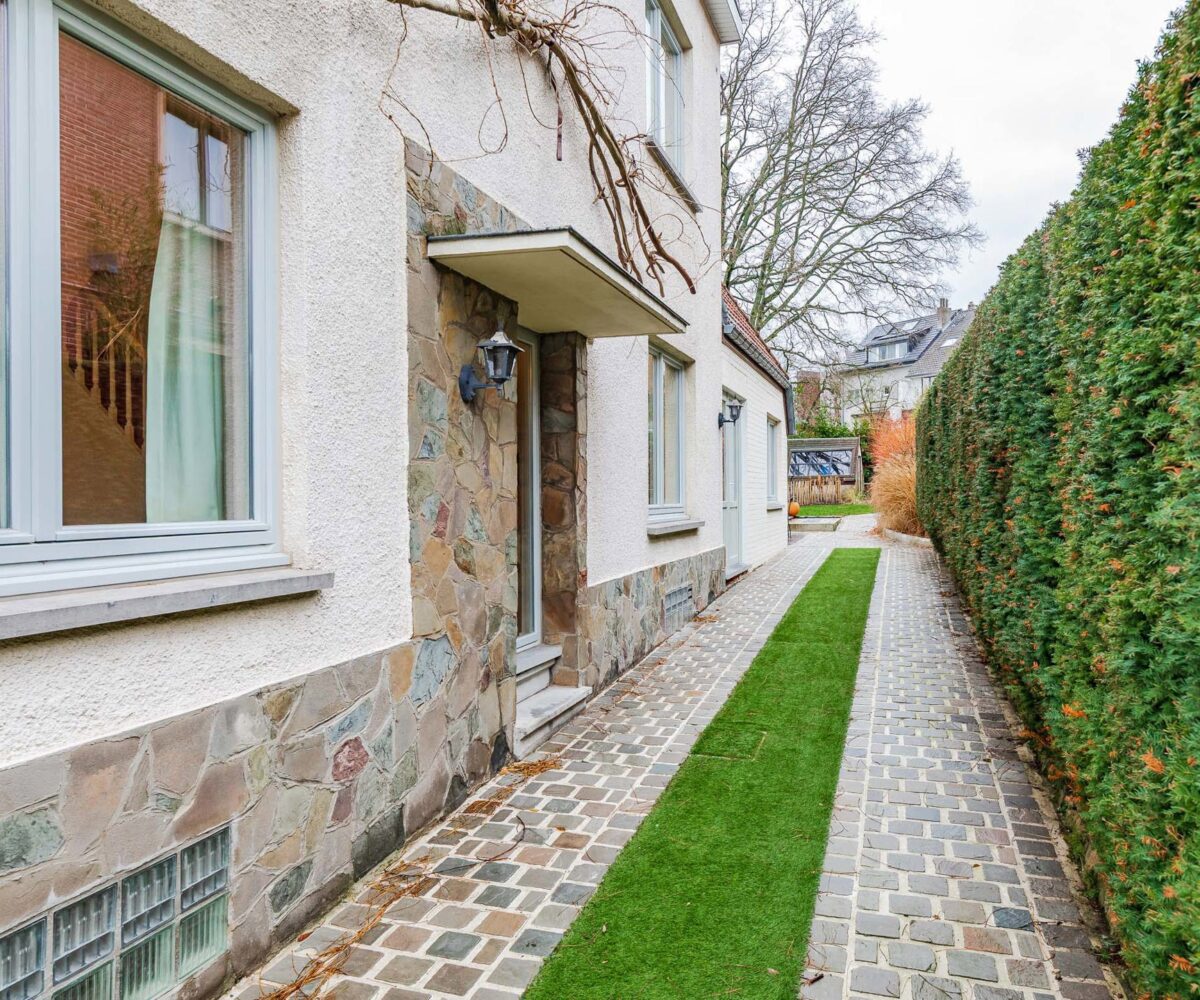 – Portail d’accès. Charmante allée latérale menant à l’entrée et au jardin. Deux agréables terrasses en pierre bleue (2022), jardin potager, abri/atelier (rangement vélo)