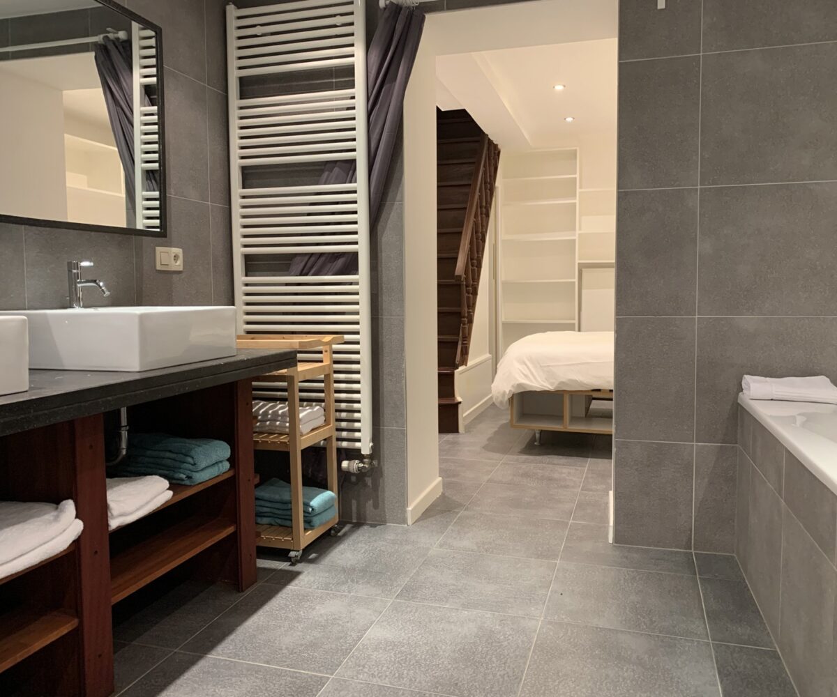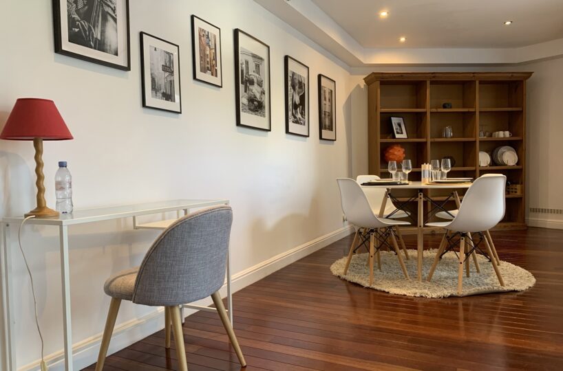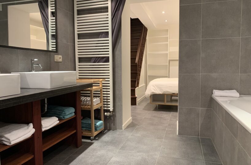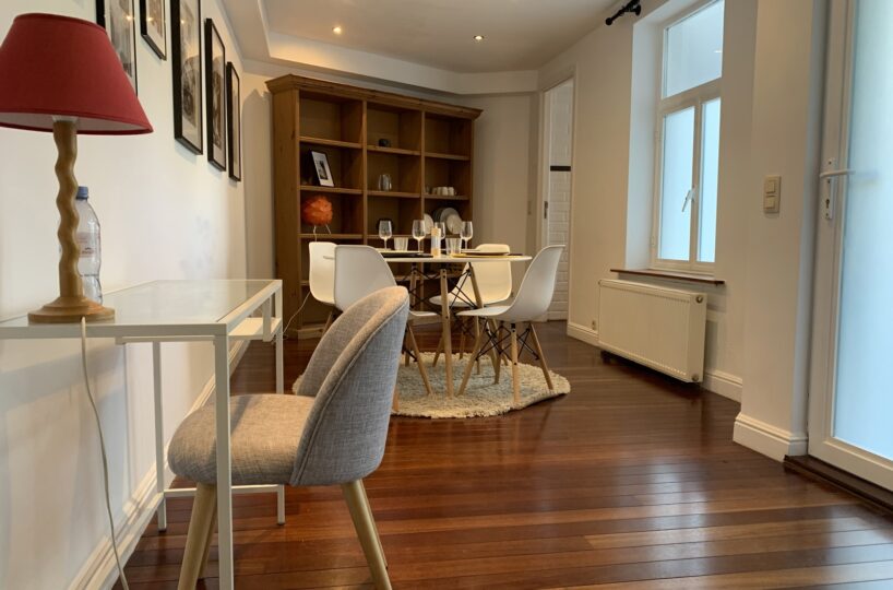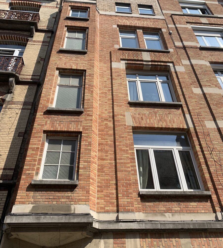 Situé au rez-de-chaussée d’une petite copropriété bien entretenue de 4 étages, l’appartement est composé comme suit : Au rez-de-chaussée, un wc séparé, une agréable pièce de vie en enfilade (+- 35m2) comprenant un espace bureau, salon et salle à manger, une cuisine super équipée. Au -1, une chambre avec nombreux rangements encastrés (reconnue comme un dressing à l’urbanisme), une salle de bain (bain, douche, double évier, wc, système ventilation) et un espace buanderie.