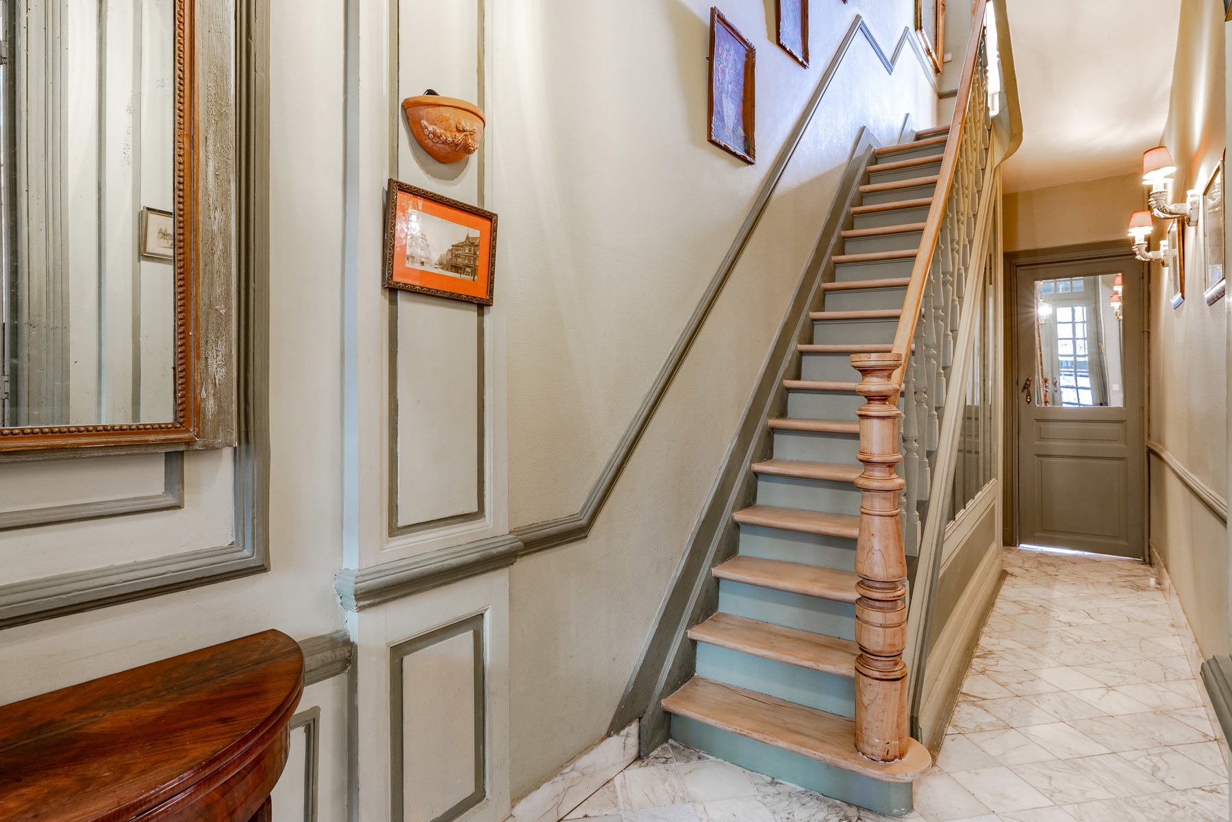 – A l’entresol : trois pièces en enfilade donnant accès immédiat au ravissant jardin, orienté sud. Une cave de rangement.